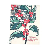 From an original block print, this card features a twig full of green leaves and sweet red berries and reads 'Warmest Holiday Wishes'.