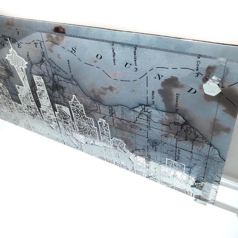 Multi-layered contemporary artwork featuring the distinctive Seattle Skyline drawn atop a vintage map of Seattle streets on clear acrylic. The artist draws with white ink following the map lines to create the image. The transparency is then backed by an original photograph printed on aluminum.