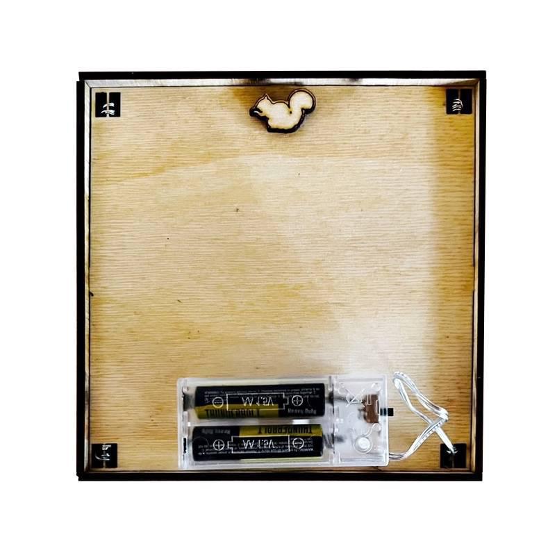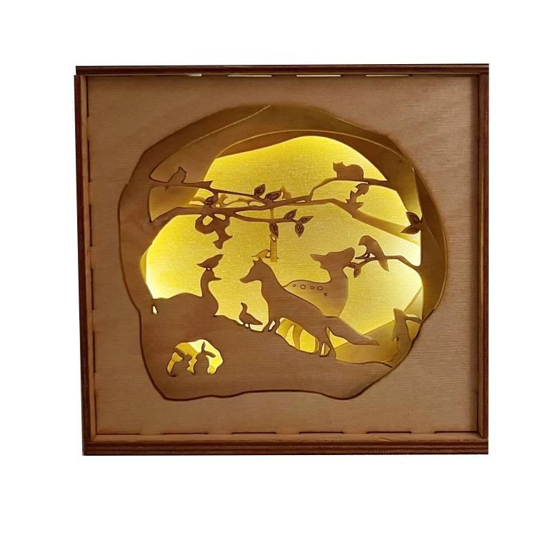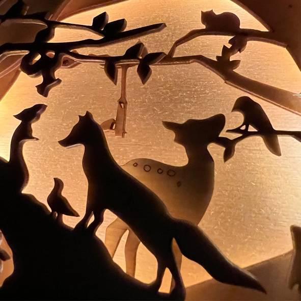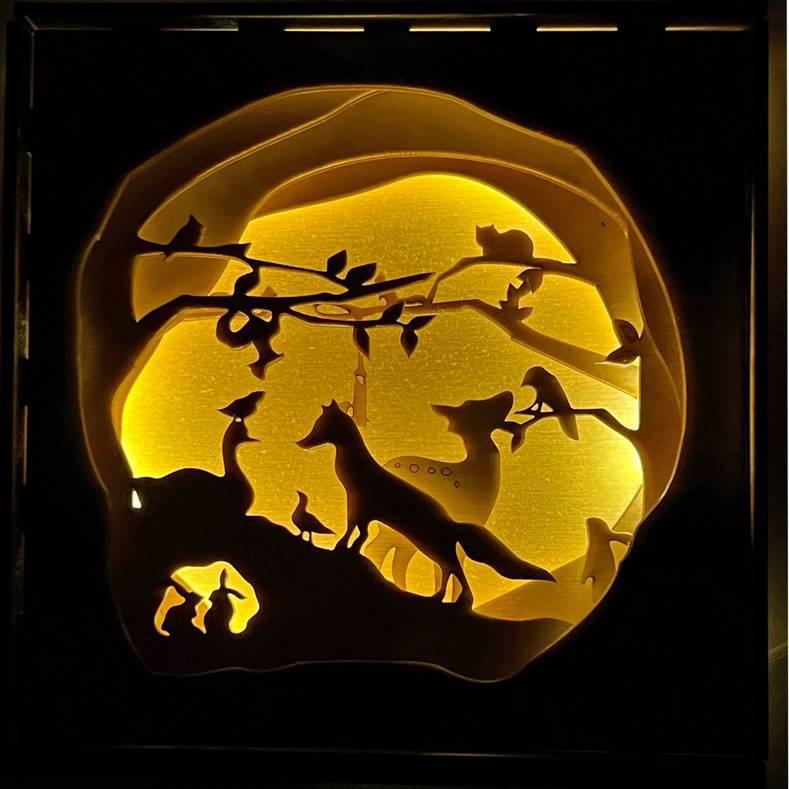Forest creatures come together for a secret meeting amongst your books! This multilayer shadow box has lights within that will make the box glow whenever you want. Perfectly sized to fit on a bookshelf or nook.