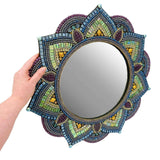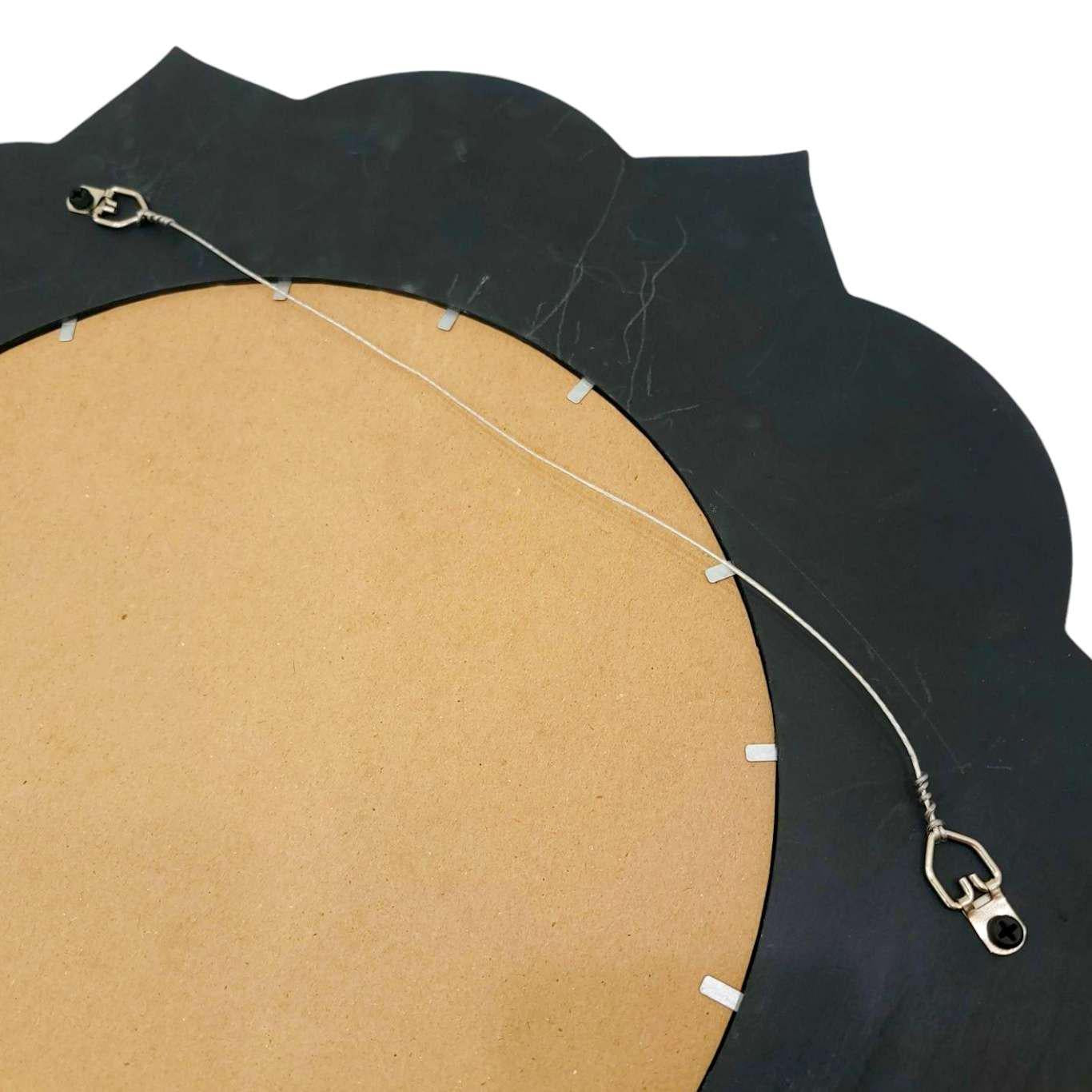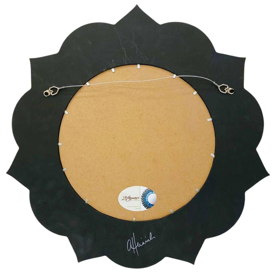 A true statement piece, this stunning mosaic mirror is dramatic and intricate with its many layers of plum purple, blue, green, and gold glass tiles and beads arranged in a detailed mandala design with seven-part symmetry. Surprisingly light and very easy to hang with a regular picture hanger thanks to the pre-installed D rings and coated wire rated at least 2-3x the weight of the mirror for a secure hold.