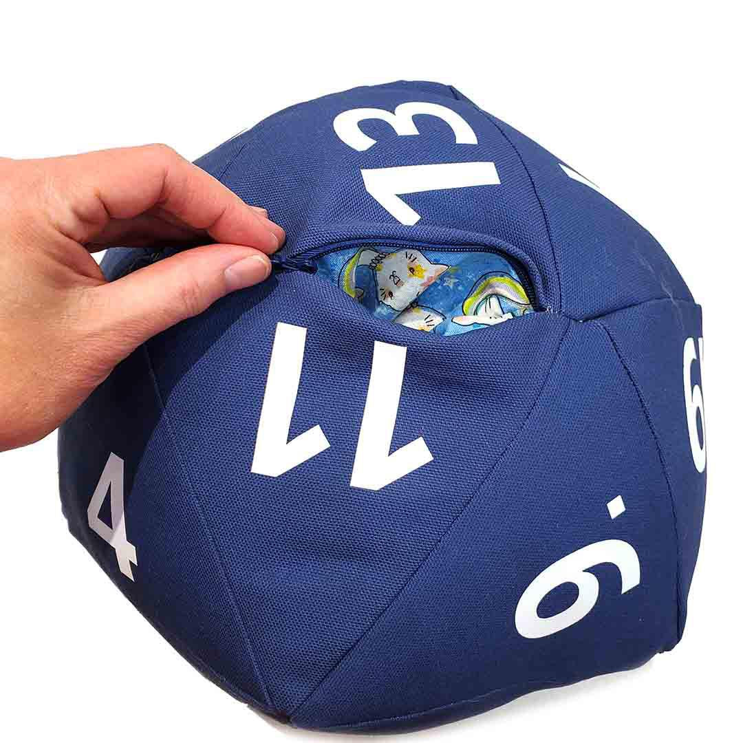 - Huggable plush D20 with hidden stash pocket along one seam