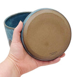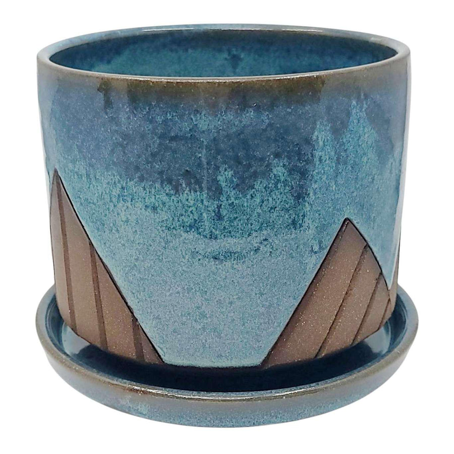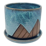This lovely large ceramic planter with drainage tray features a minimalist mountain design in bare brown stoneware against a background of deep, swirled blue glaze inspired by the night sky.