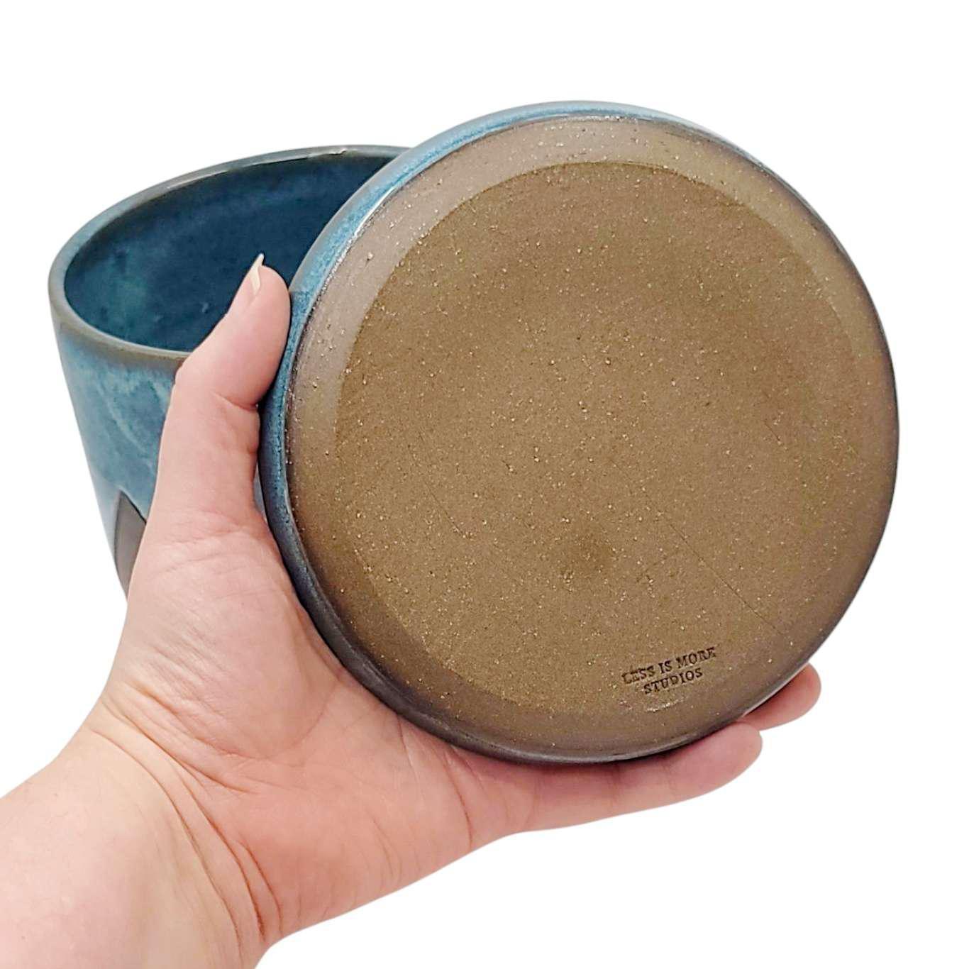 Every item made by Less Is More is hand carved and finished with glazes that they make at their studio from raw materials. These pieces truly highlight the natural beauty of the materials. Made from stoneware clay that is wheel thrown, then altered, and finished with glazes designed in their studio.