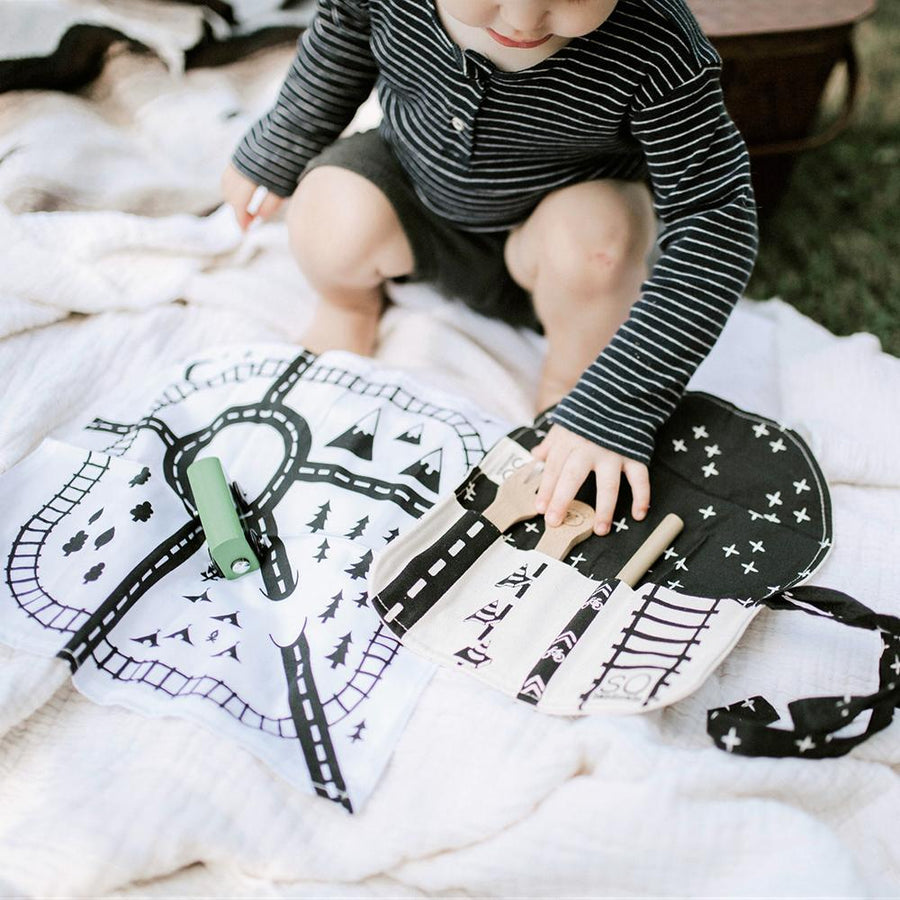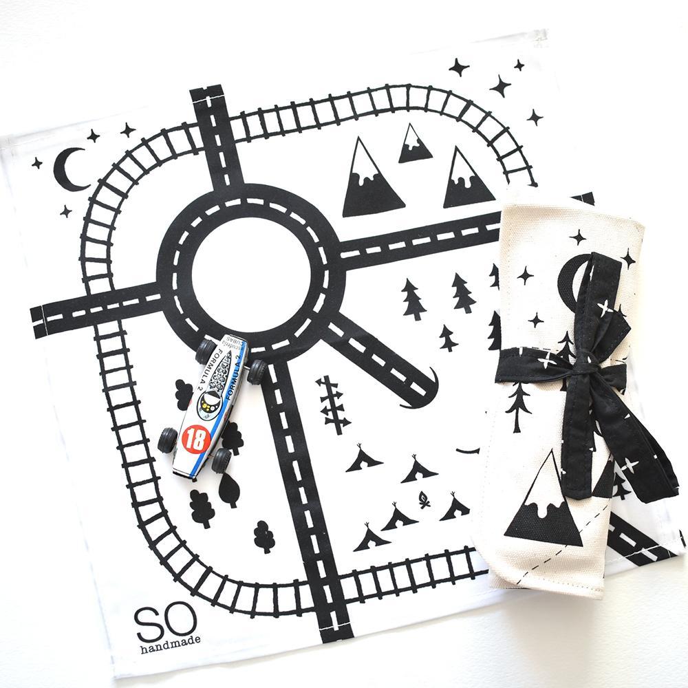 To complete the set, a napkin printed with various roadways serves as both play mat and cleanup cloth.