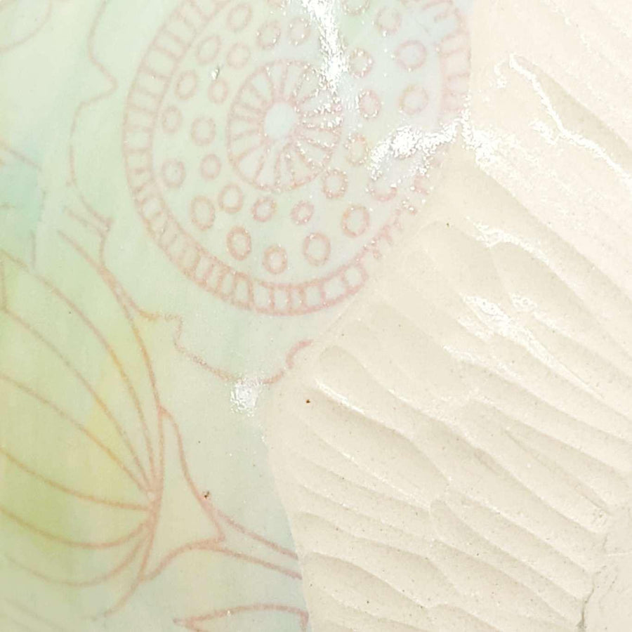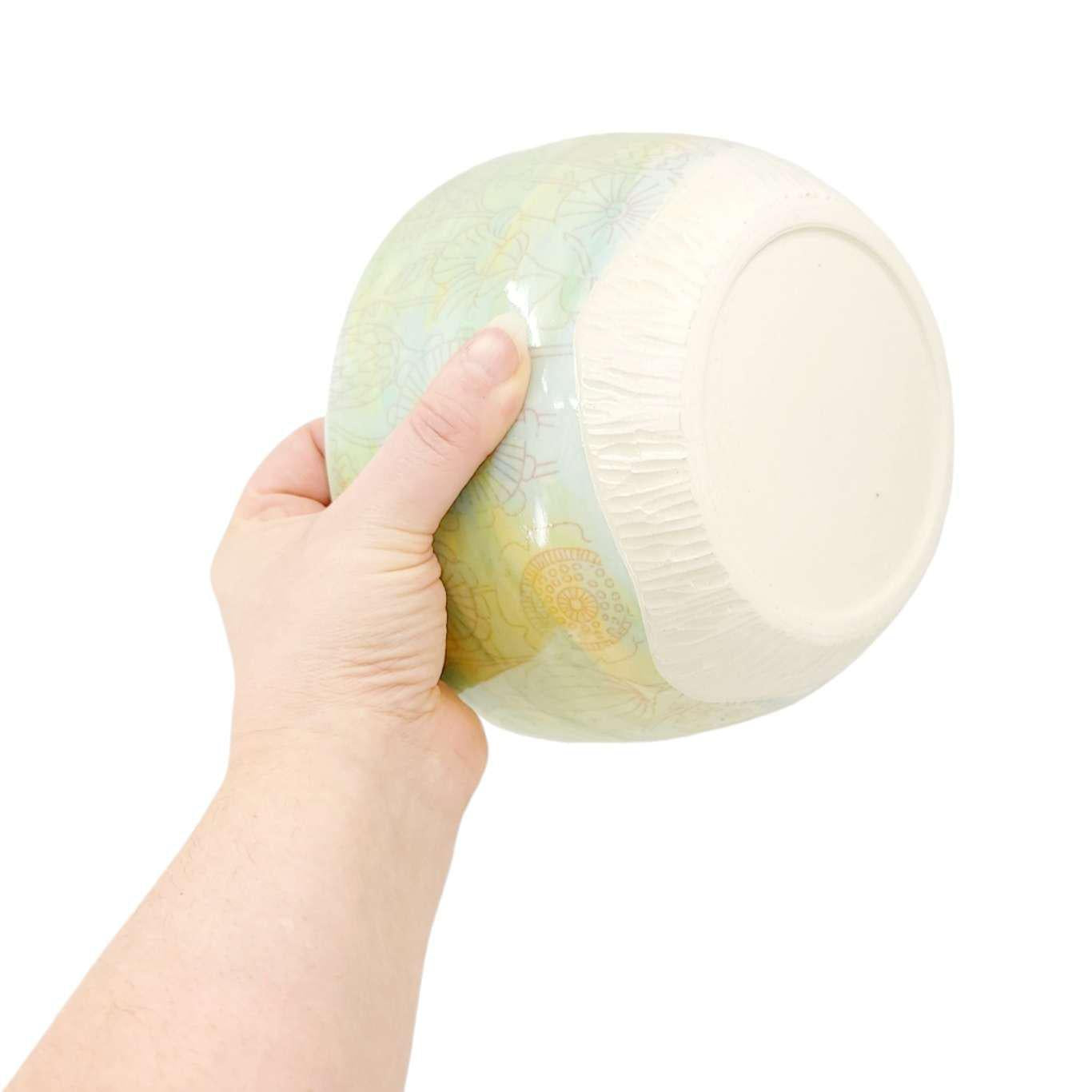 This large hand-thrown bowl is decorated in delicate blue, green, and yellow glazed stoneware bowl has pink flowers and carved details at the base.