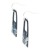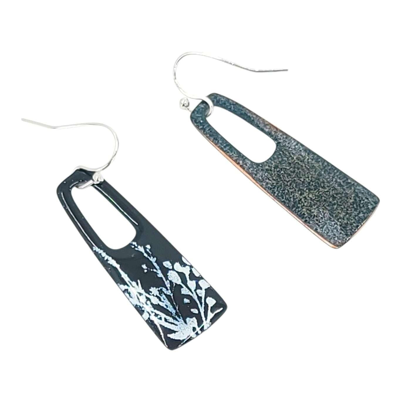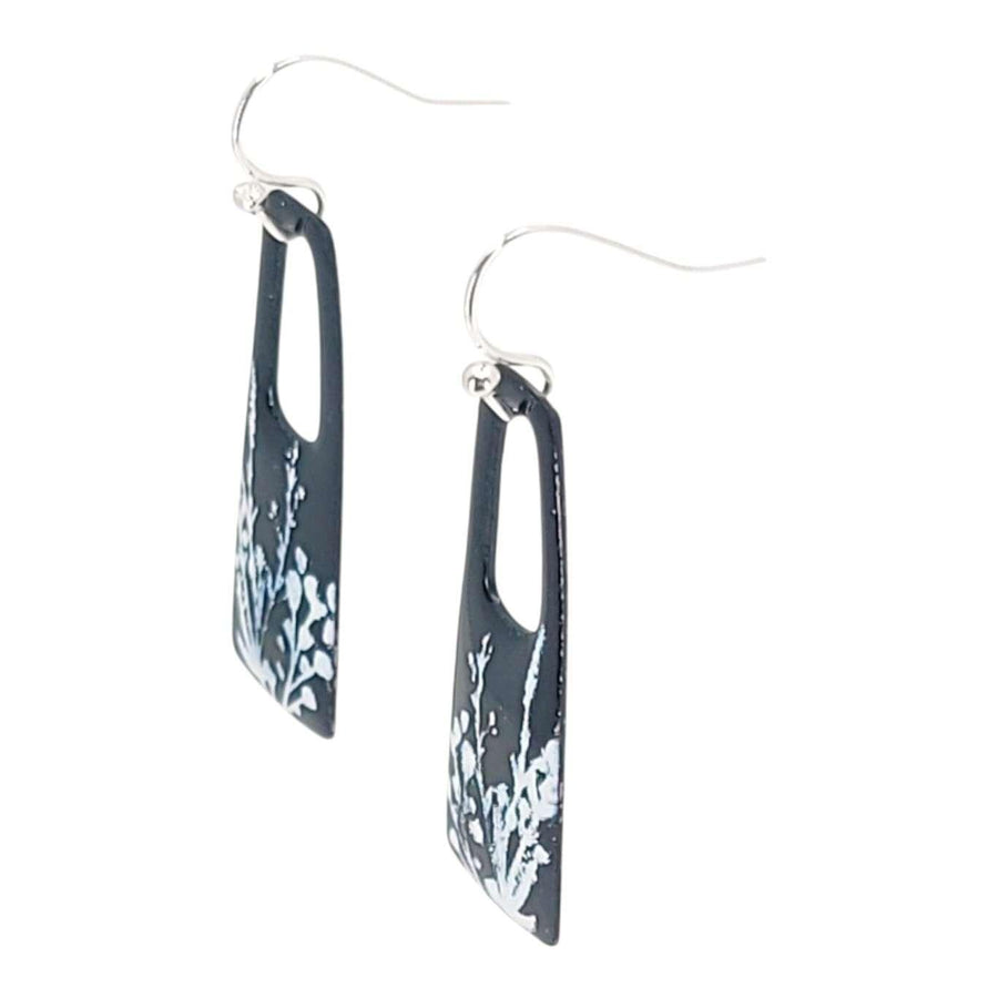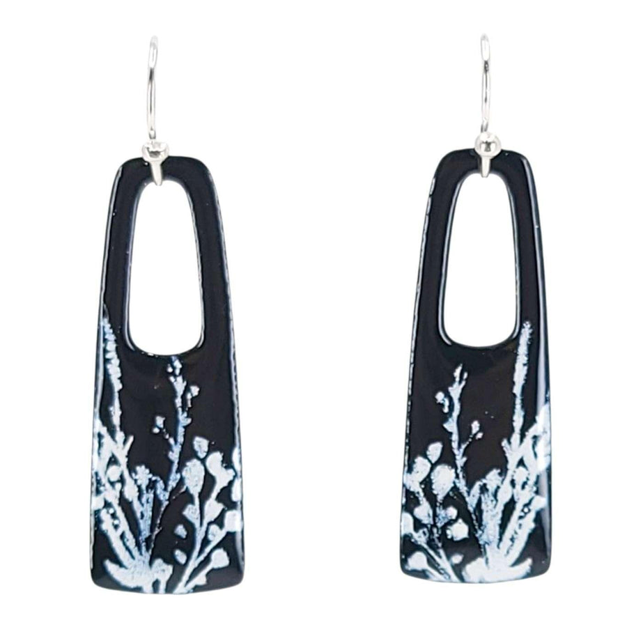 Long open rectangular earrings with a copper core decorated in a white botanical design on a black background.