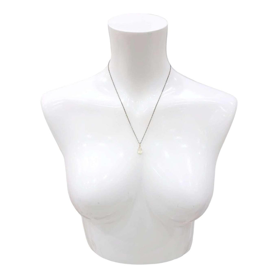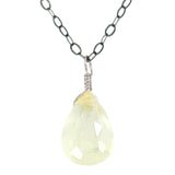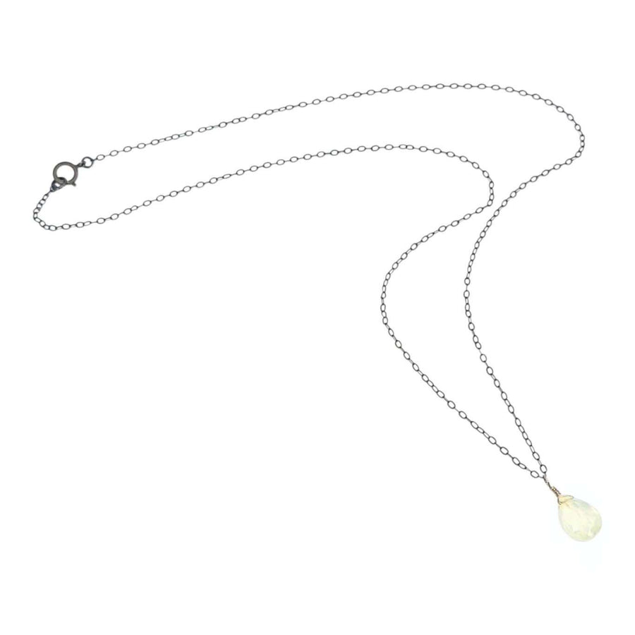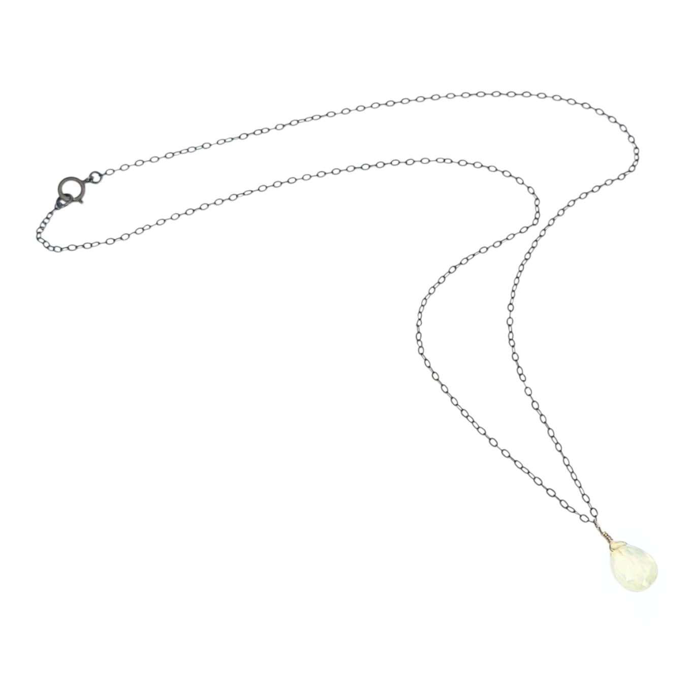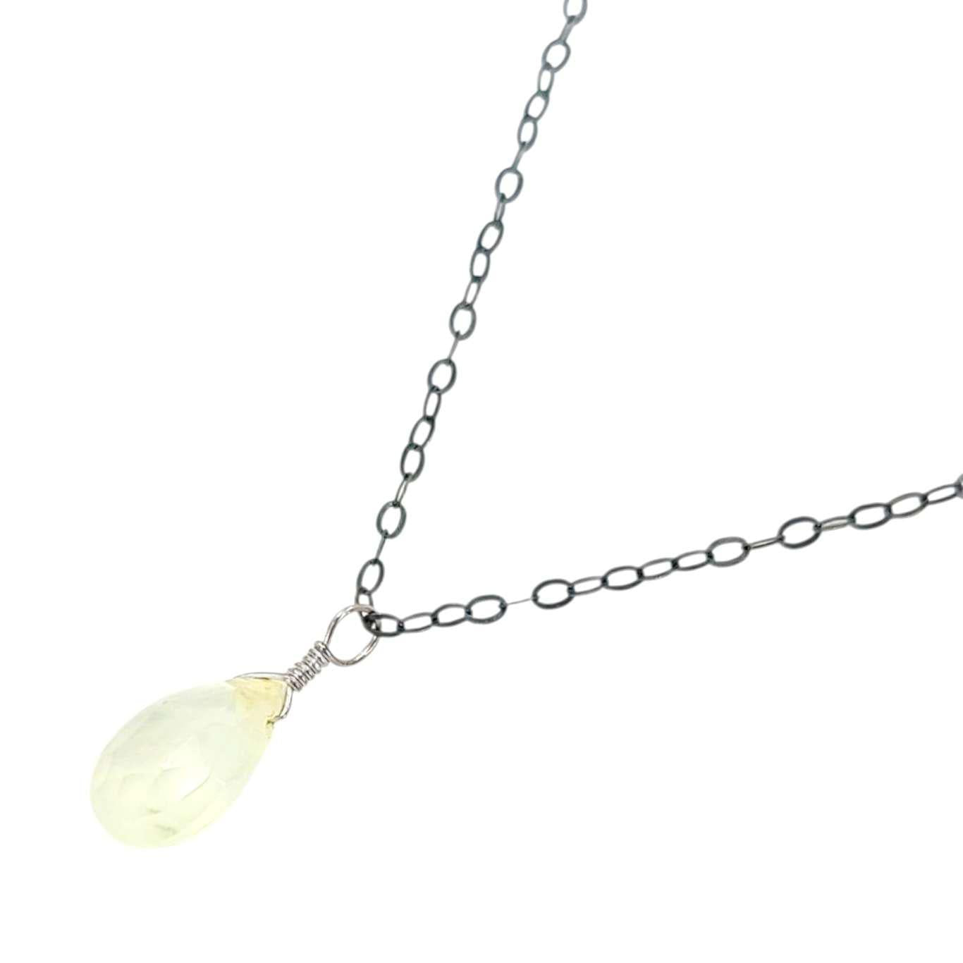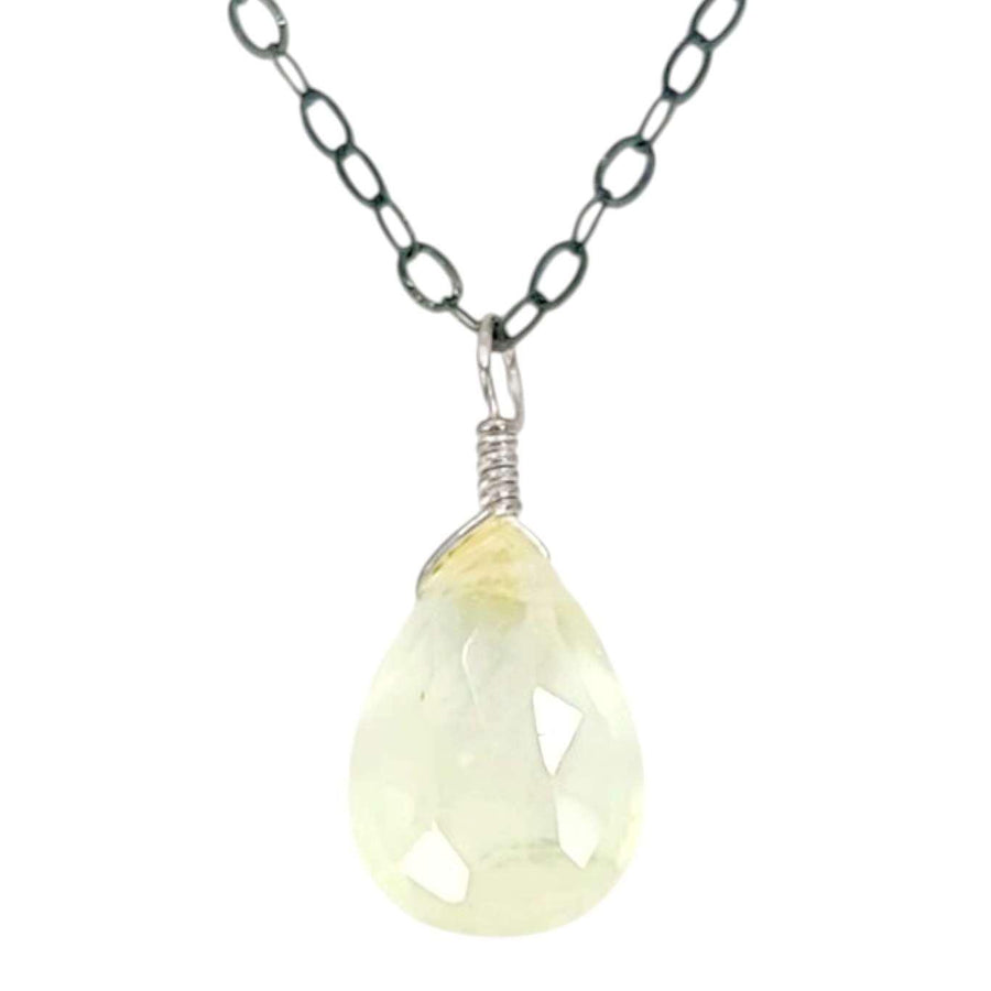 A faceted teardrop of translucent pale green prehnite rests on an 18-inch oxidized sterling silver chain.