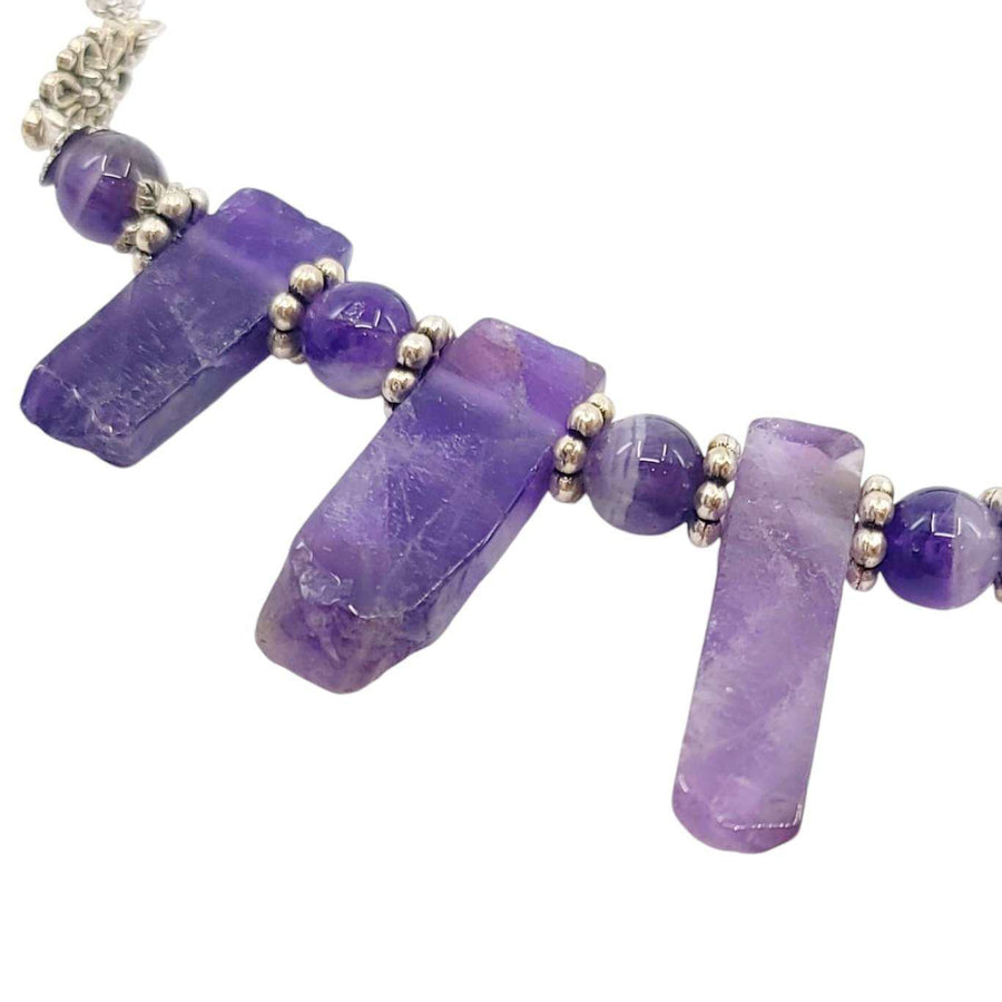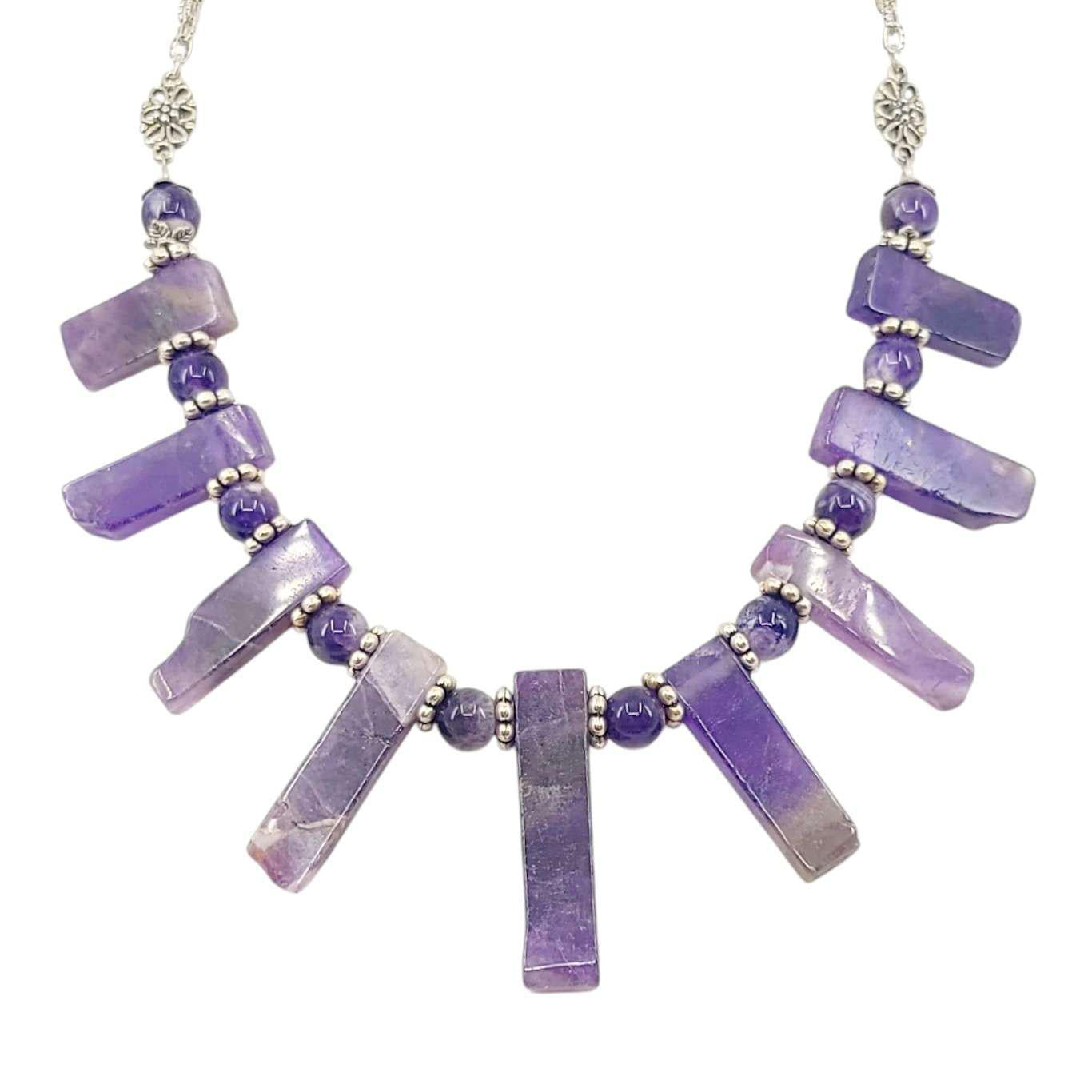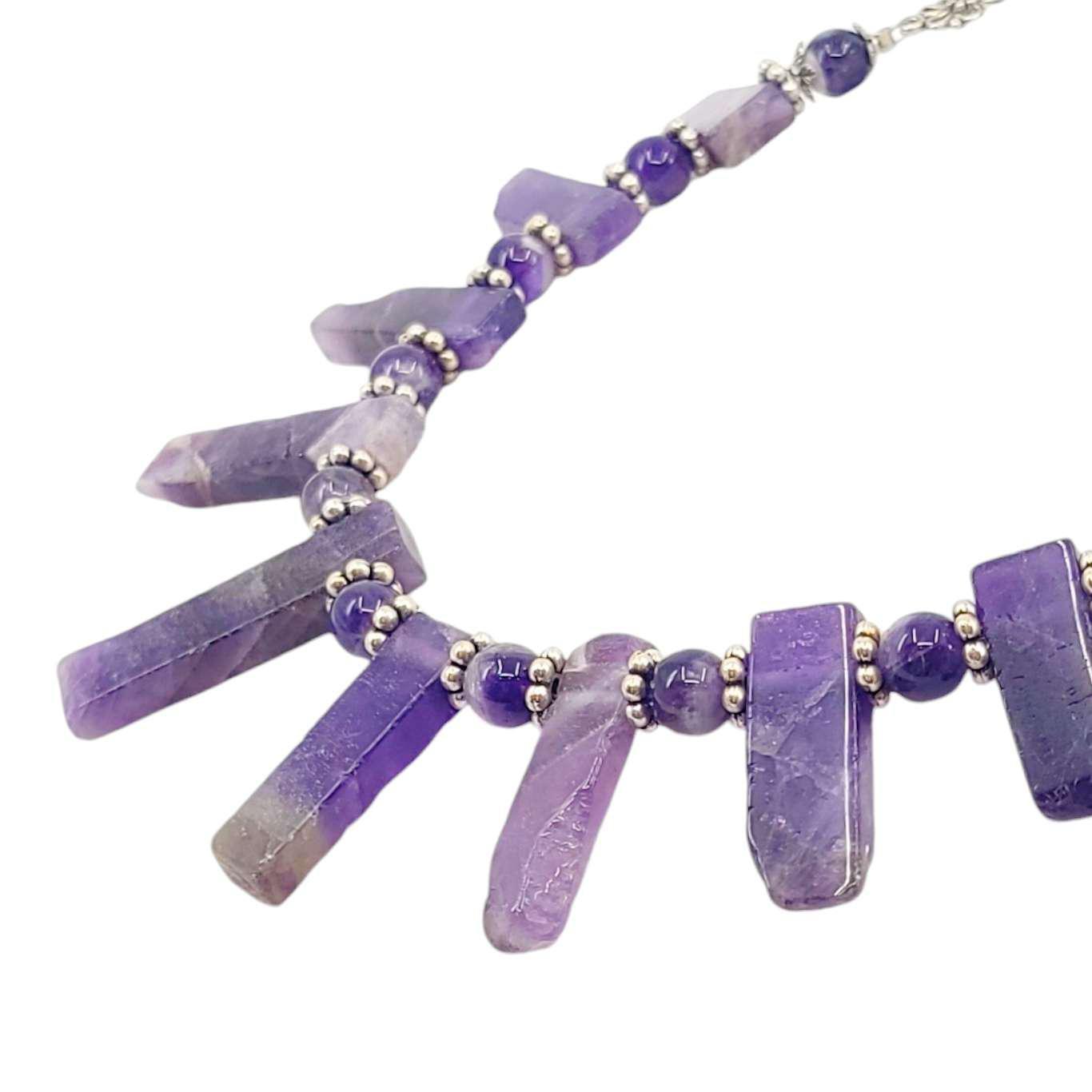 Big slabs of amethyst with naturally textured ends are separated by polished amethyst beads and accented with silver on this stunning statement necklace.