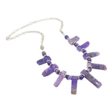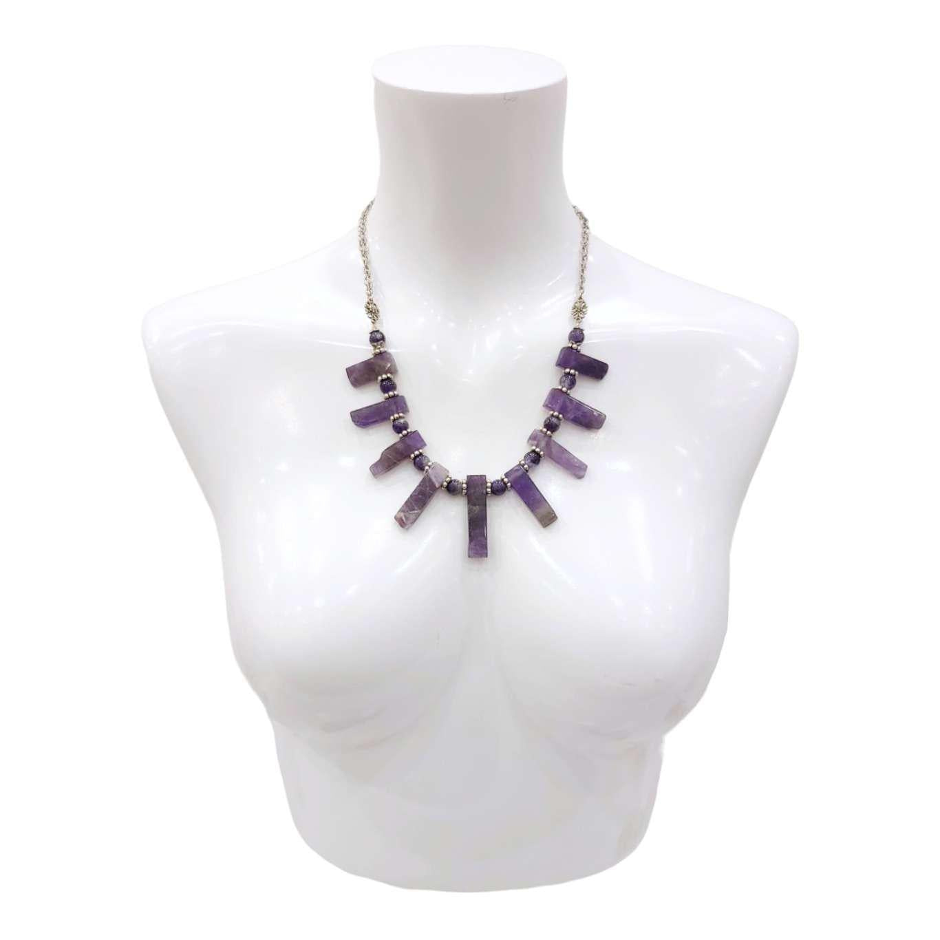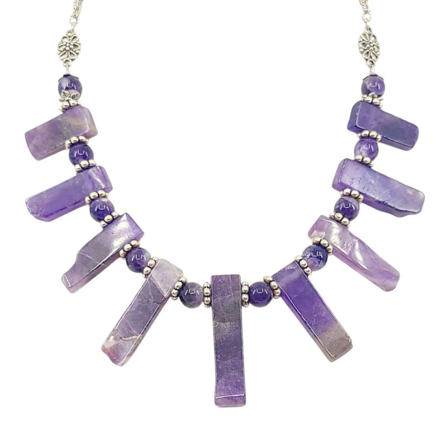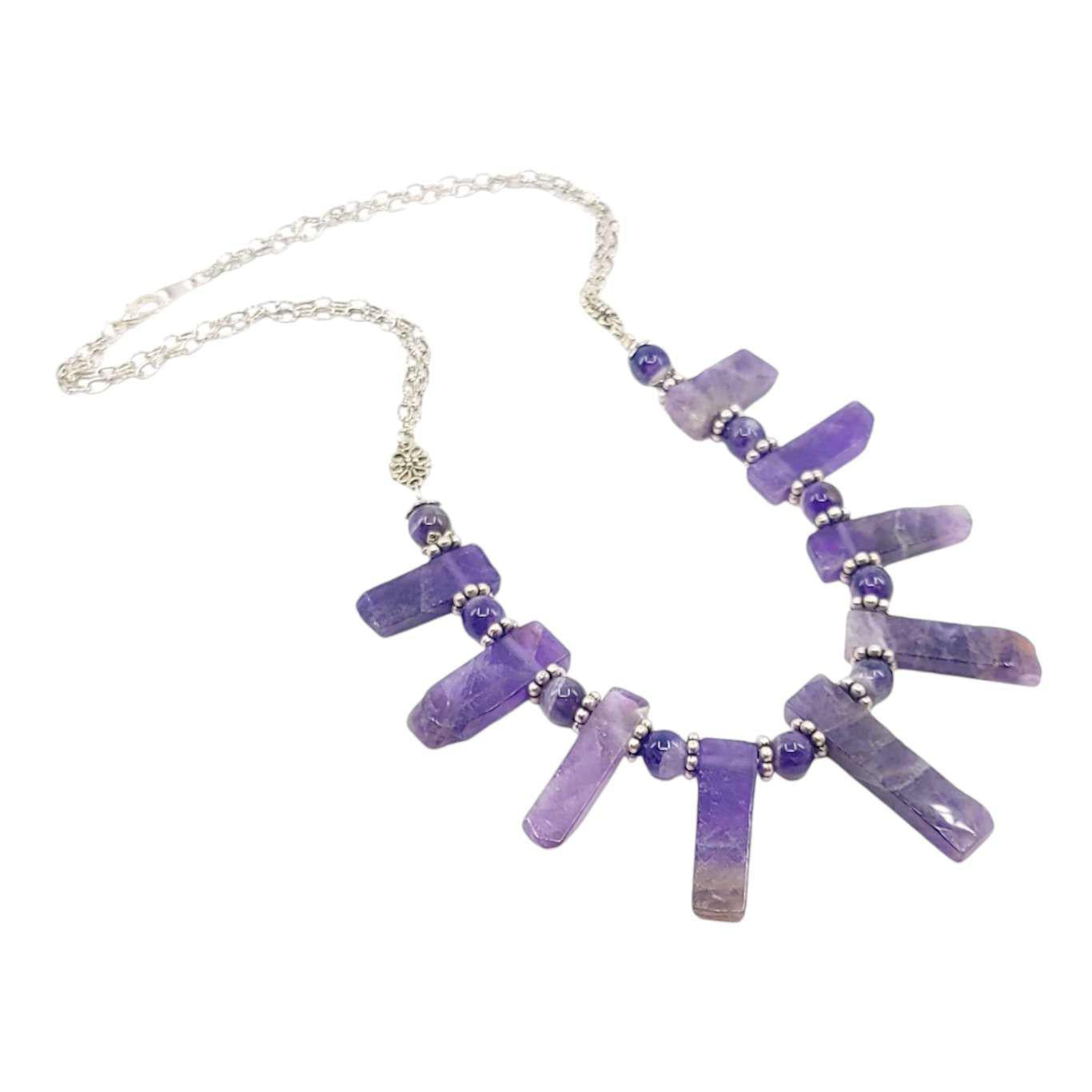 Big slabs of amethyst with naturally textured ends are separated by polished amethyst beads and accented with silver on this stunning statement necklace.