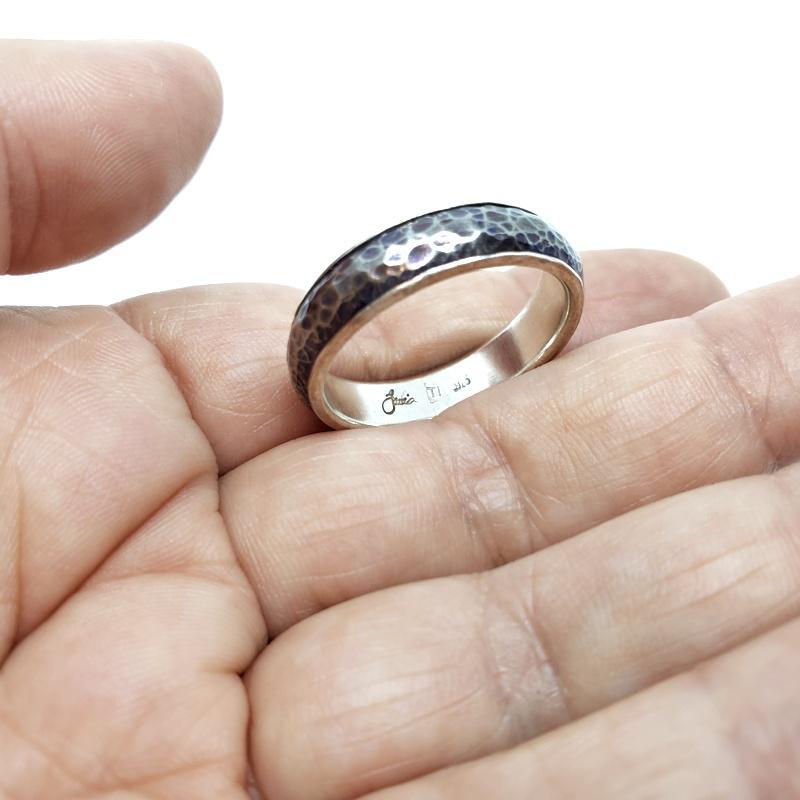 The band measures 6mm wide with a half-round profile. The titanium has a ball-peen hammered texture and a blue patina which provides the ring with a subtle hint of color.
