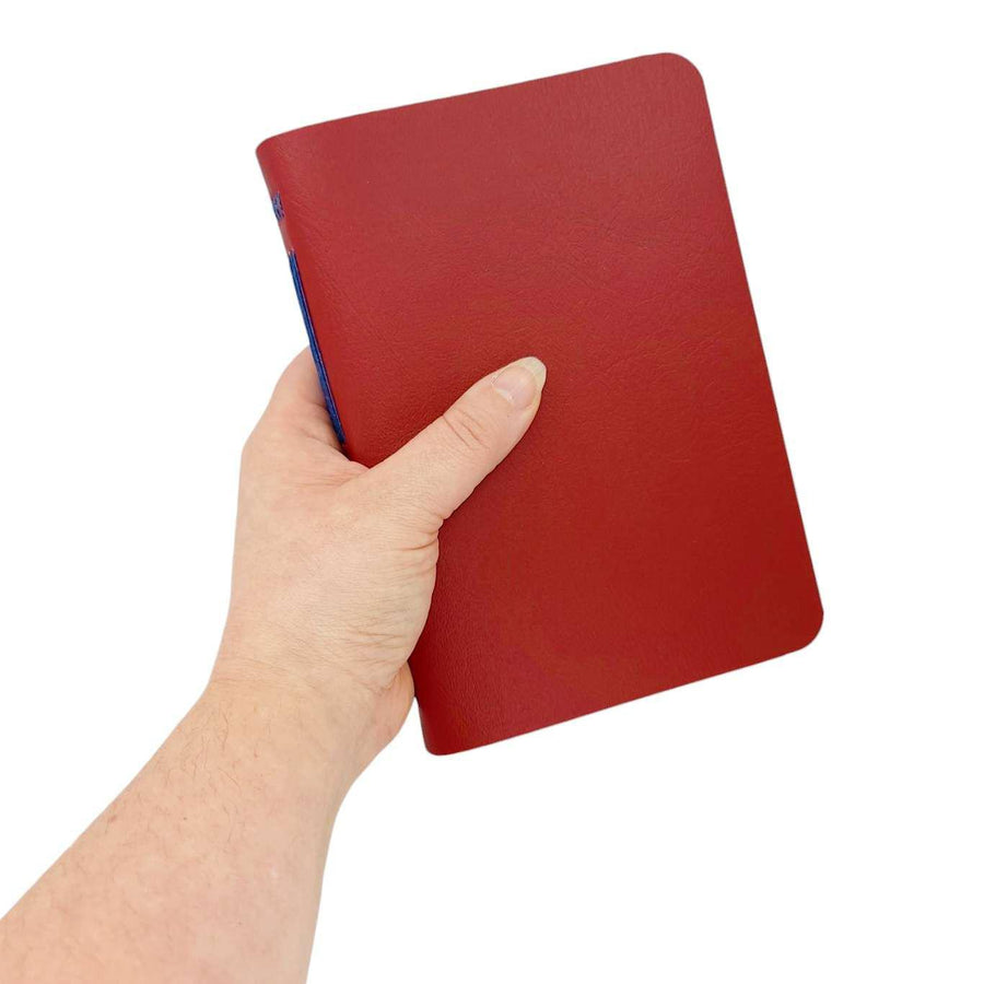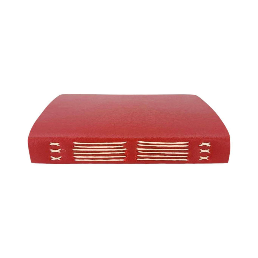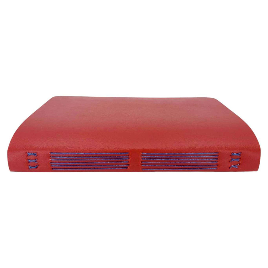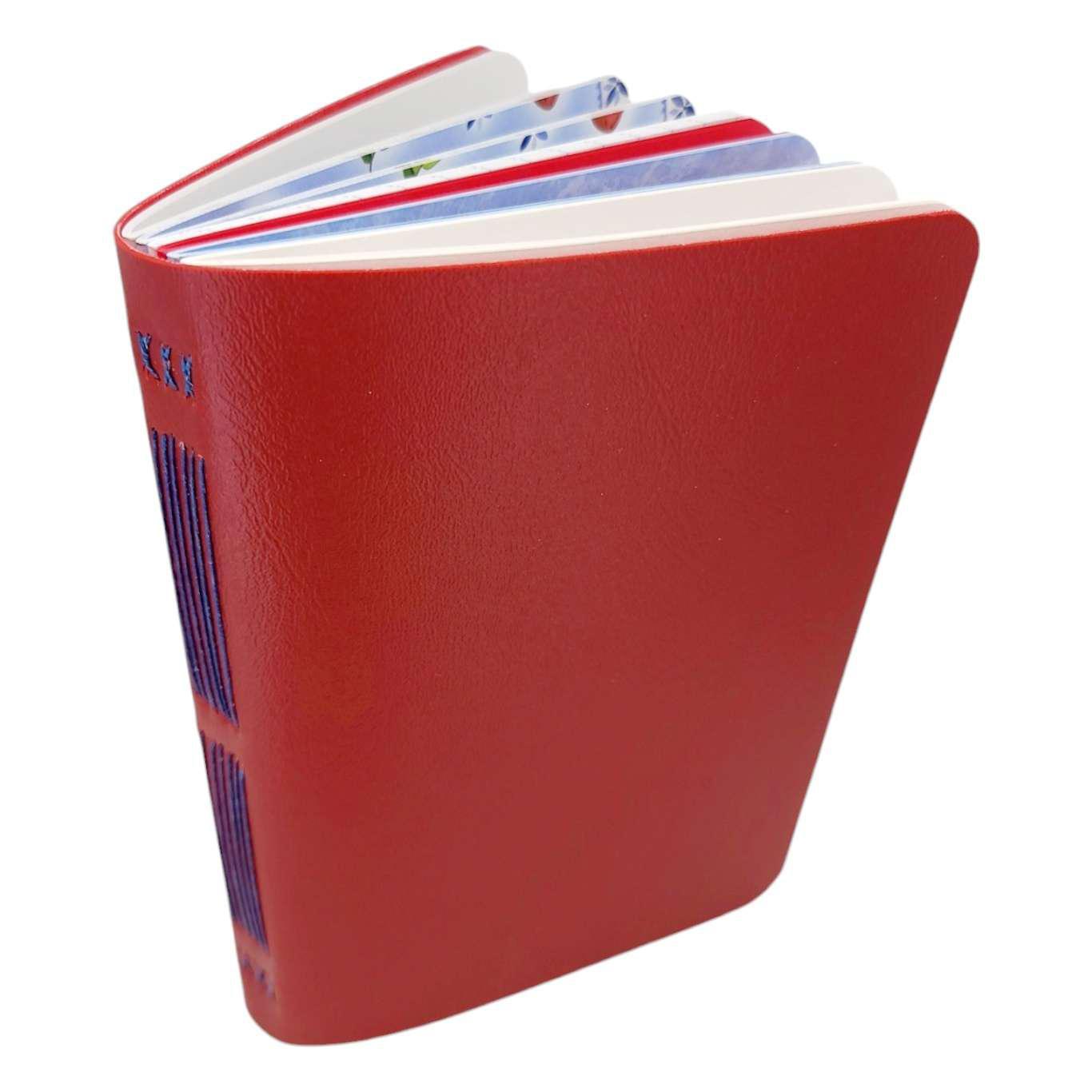 Available in two sizes, each one of these hand sewn mixed paper notebooks with a durable red vegan leather cover is one-of-a-kind. The journals open flat and the rounded corners keep your pages protected. The books are stitched by hand using a contrasting colored waxed linen thread. Each journal features six sections of assorted paper and a pocket made from an envelope, perfect for storing paper ephemera and photos. The paper coordinates with the color of the cover and thread. Possible papers included are: