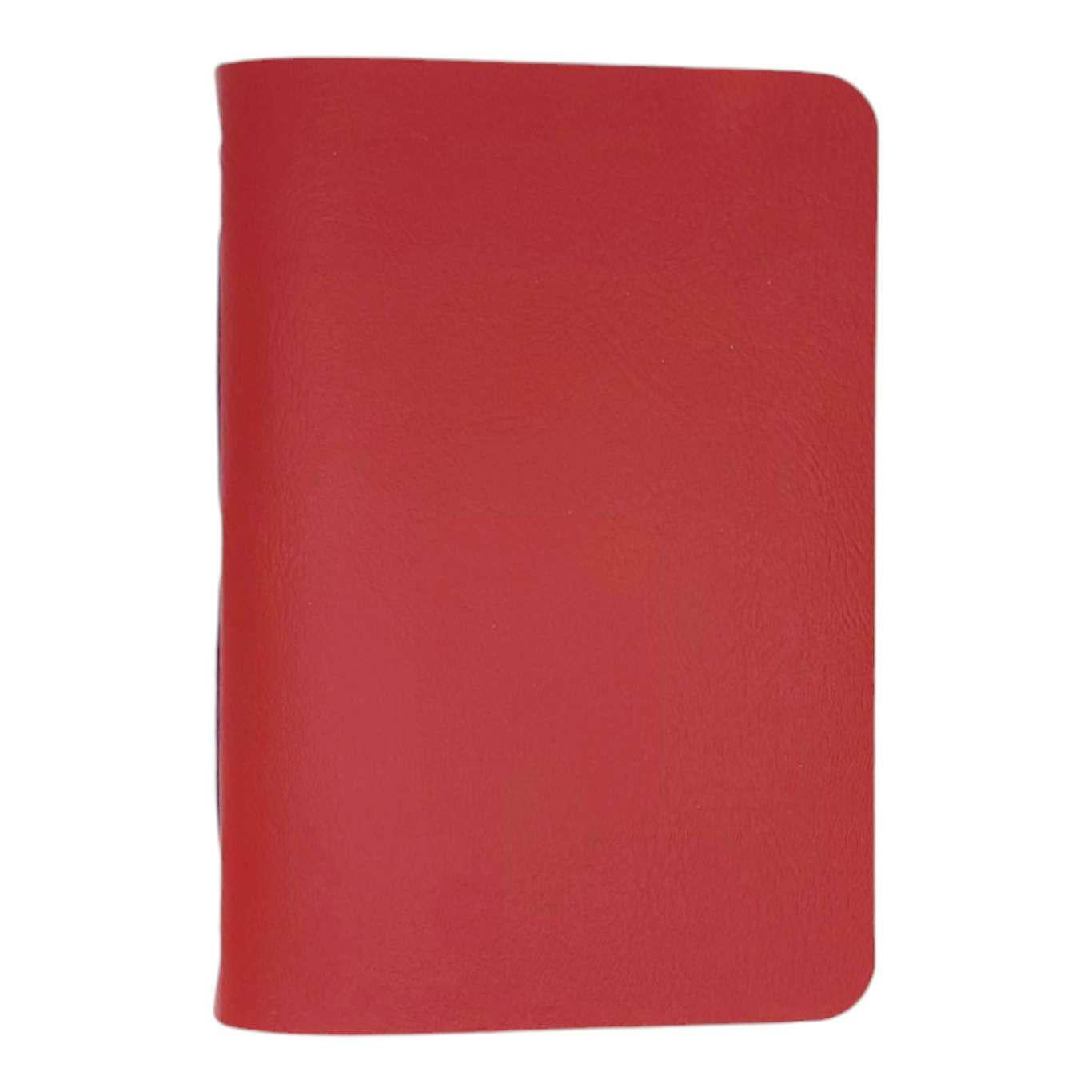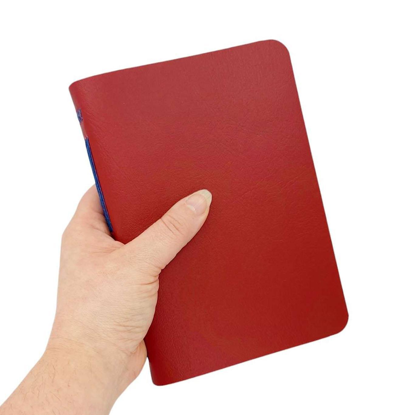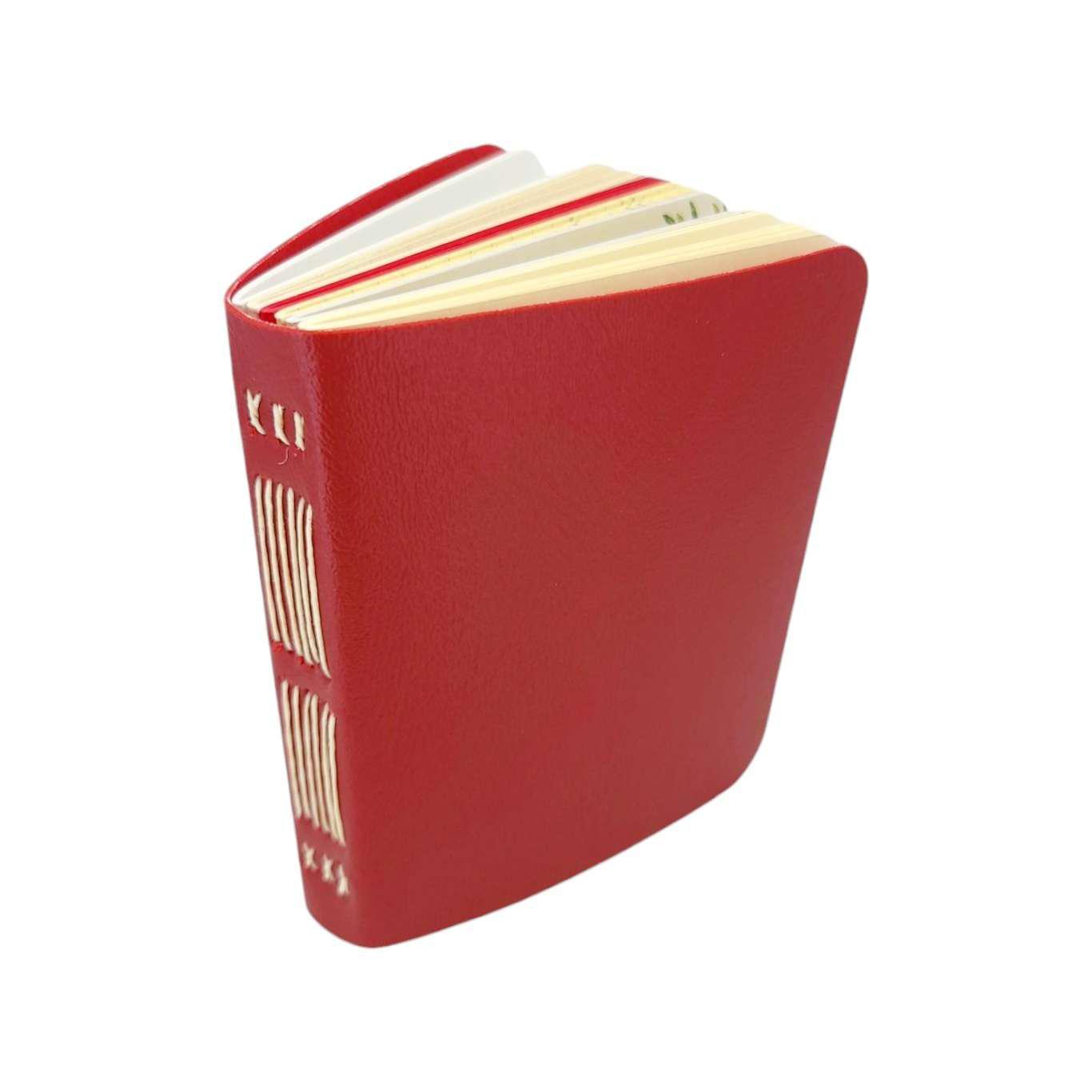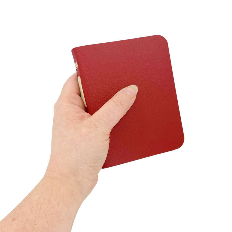 Available in two sizes, each one of these hand sewn mixed paper notebooks with a durable red vegan leather cover is one-of-a-kind. The journals open flat and the rounded corners keep your pages protected. The books are stitched by hand using a contrasting colored waxed linen thread. Each journal features six sections of assorted paper and a pocket made from an envelope, perfect for storing paper ephemera and photos. The paper coordinates with the color of the cover and thread. Possible papers included are:
