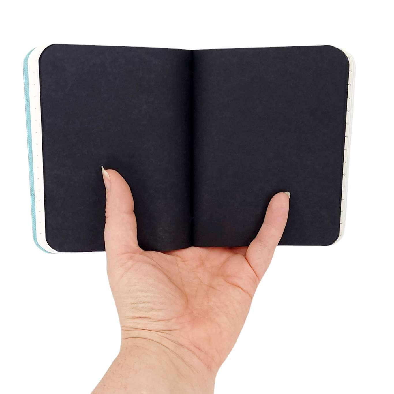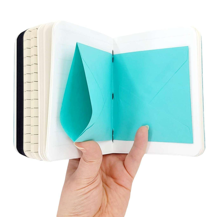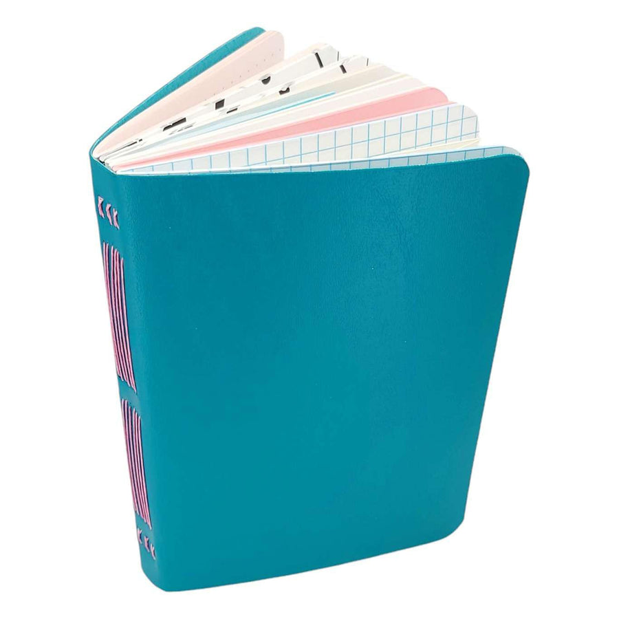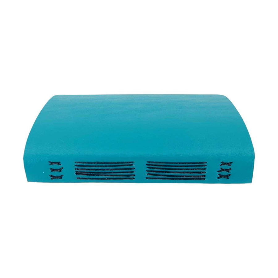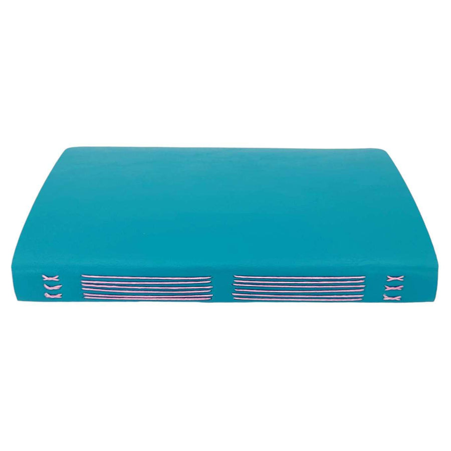 Available in two sizes, each one of these hand sewn mixed paper notebooks with a durable teal vegan leather cover is one-of-a-kind. The journals open flat and the rounded corners keep your pages protected. The books are stitched by hand using a contrasting colored waxed linen thread. Each journal features six sections of assorted paper and a pocket made from an envelope, perfect for storing paper ephemera and photos. The paper coordinates with the color of the cover and thread. Possible papers included are: