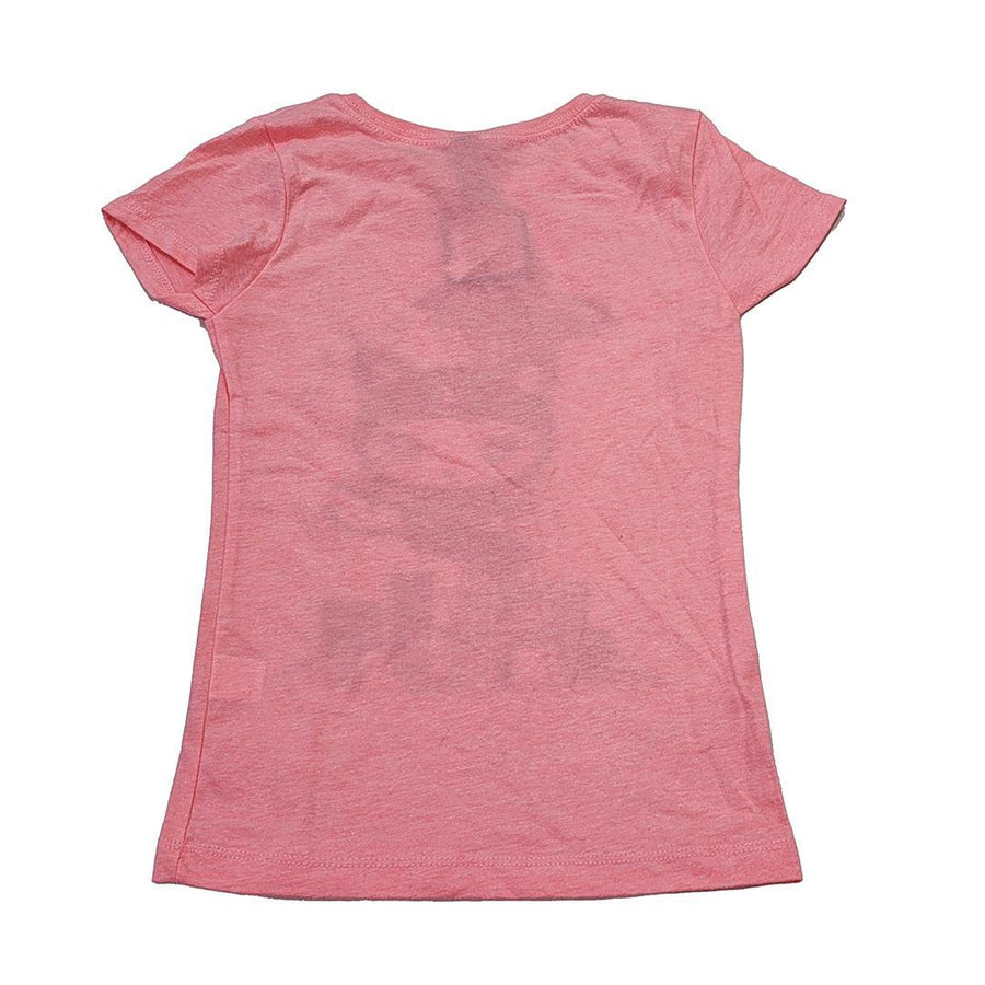 - Screen-printed in purple ink on a pink tee