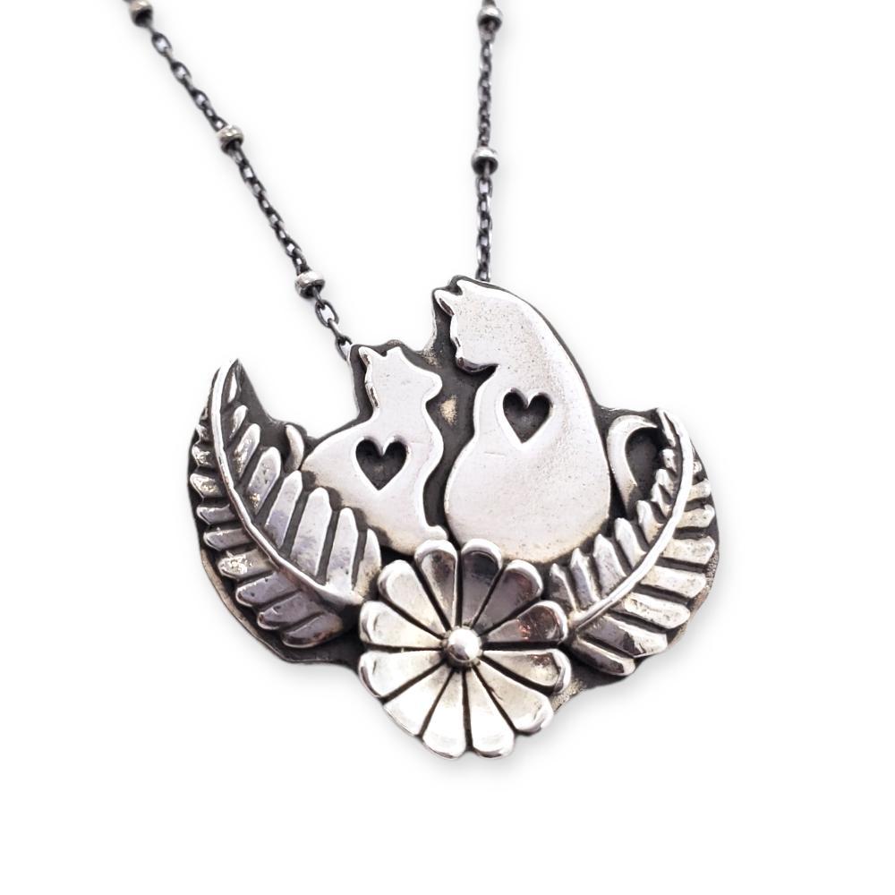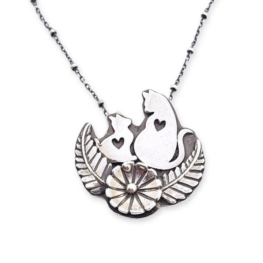 Two cats--big and small--look at each other in this sweet sterling silver pendant. Each cat's silhouette features a heart-shaped cutout at the center. A leaf-and-flower design serves as sitting spot for our feline friends.