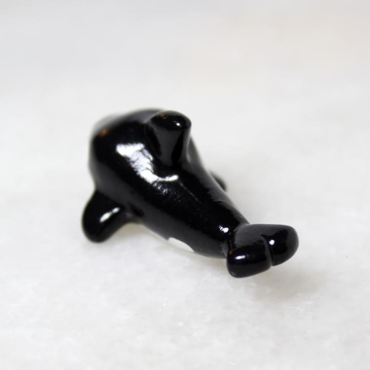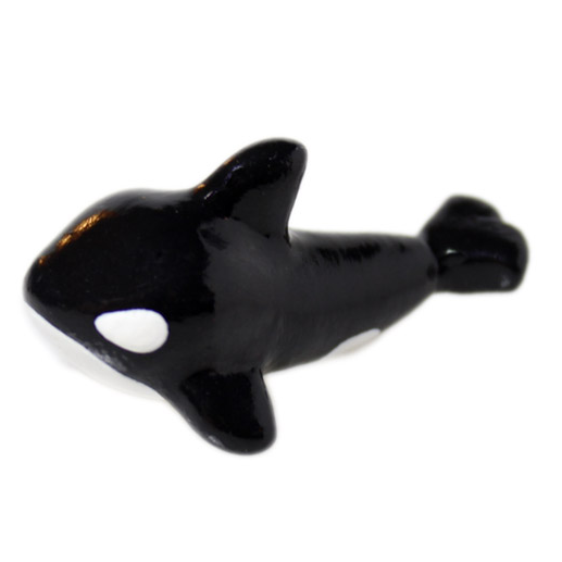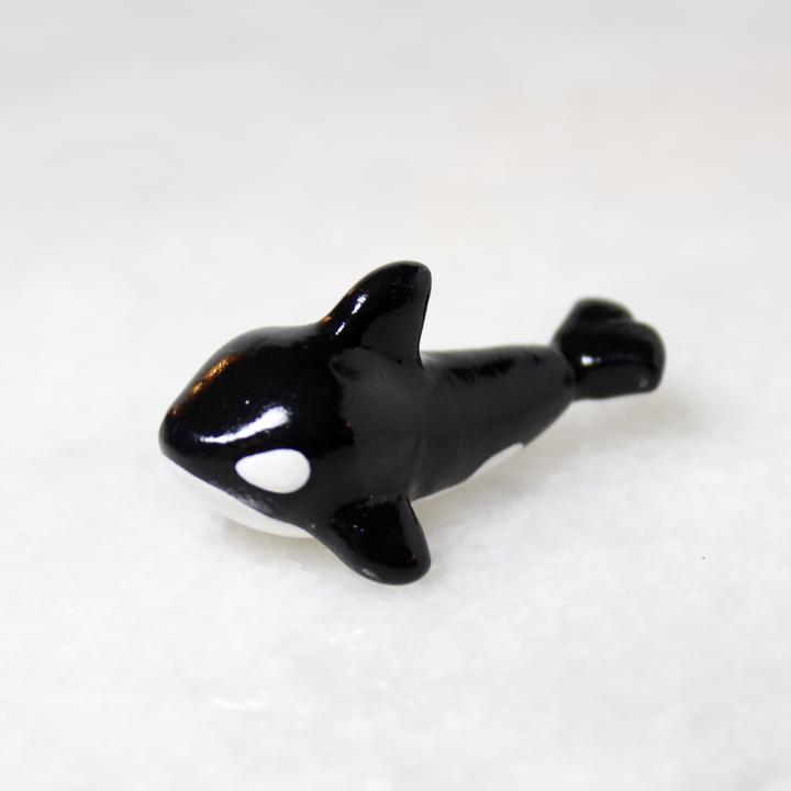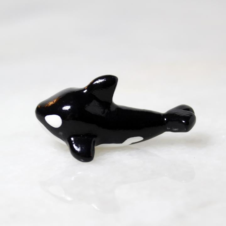 This tiniest of orca figurines is handmade with polymer clay, handpainted with acrylic paint and finished with a durable glossy varnish.