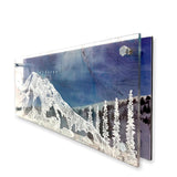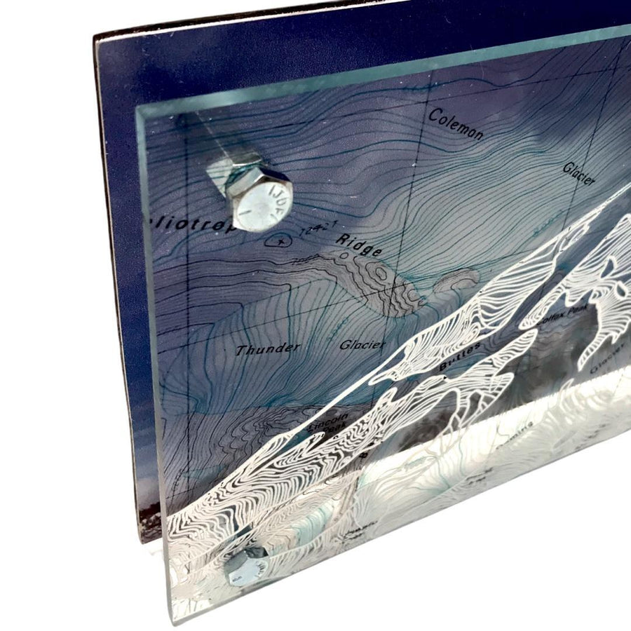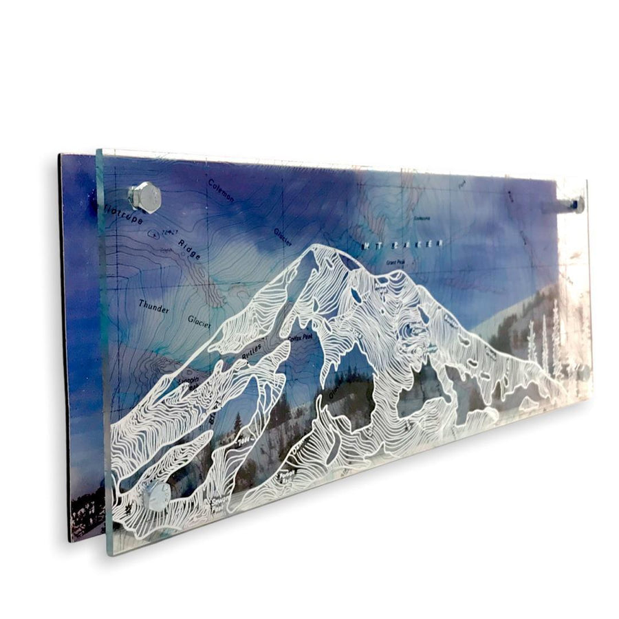 Multi-layered contemporary artwork featuring an image of Mount Baker and several trees atop a topographic map of Mount Baker National Forest on clear acrylic. The artist draws with white ink following the topographic lines to create the mountain image. The transparency is then backed by an original photograph printed on aluminum.