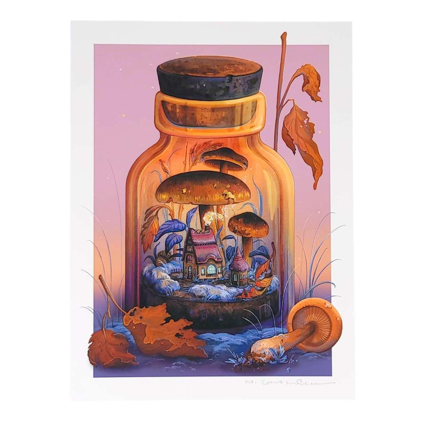 This print features mushrooms, leaves, and a cozy little autumnal dwelling encased in a corked bottle.