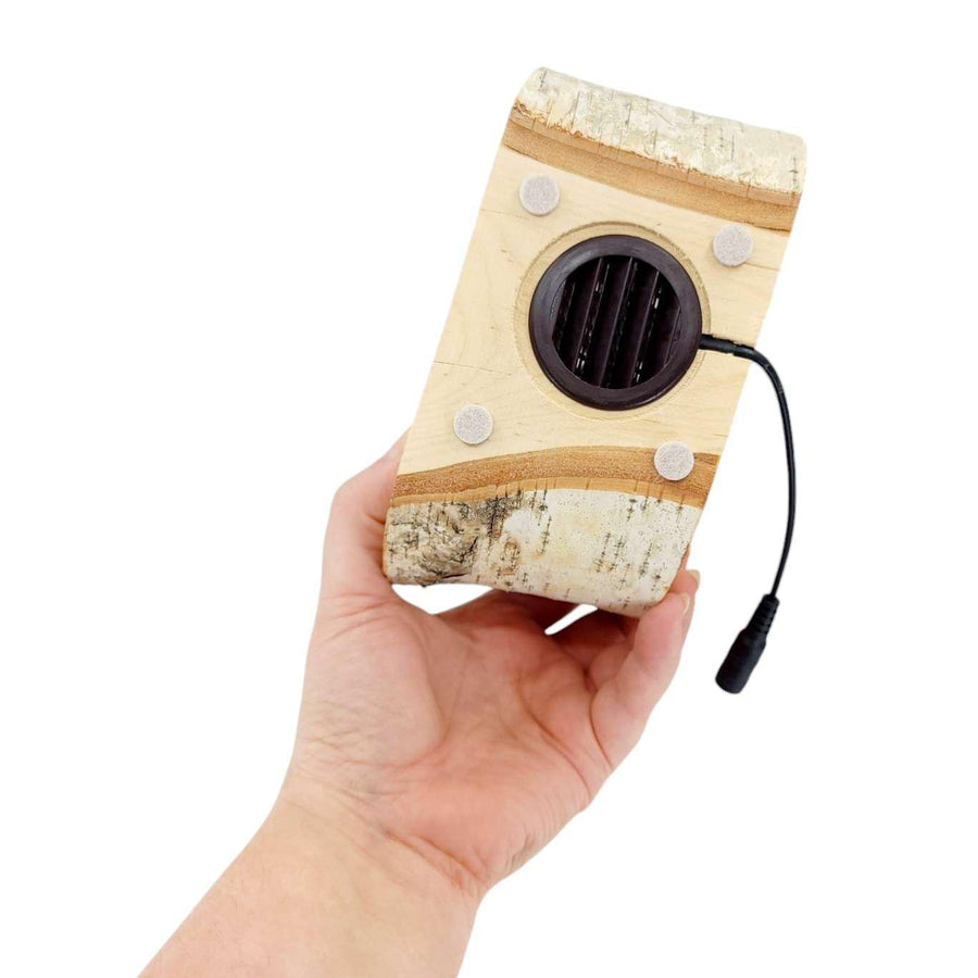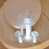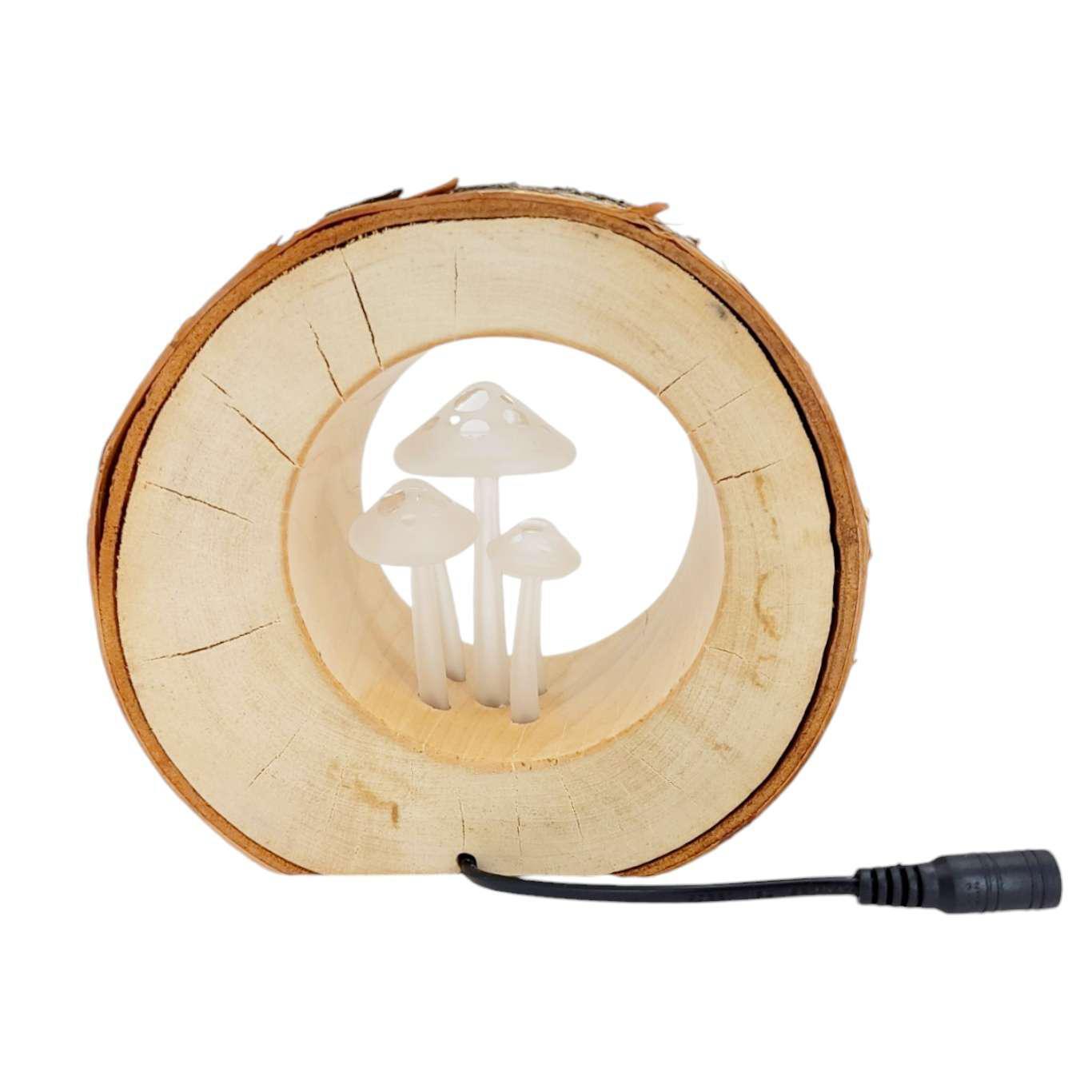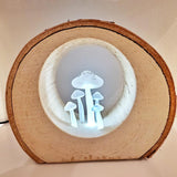 A slice from a real birch log is hollowed out to frame skillfully lampworked glass mushrooms in white with clear-spotted caps. Mushrooms are illuminated from within by LED lights.