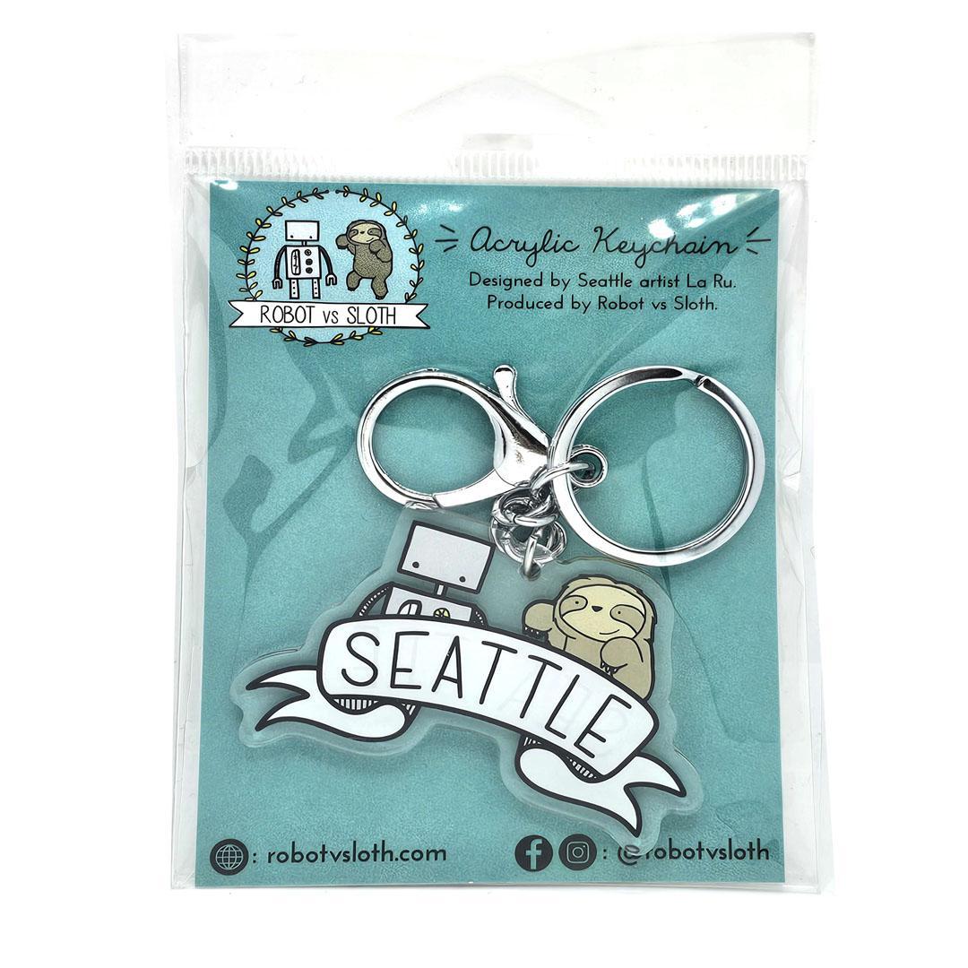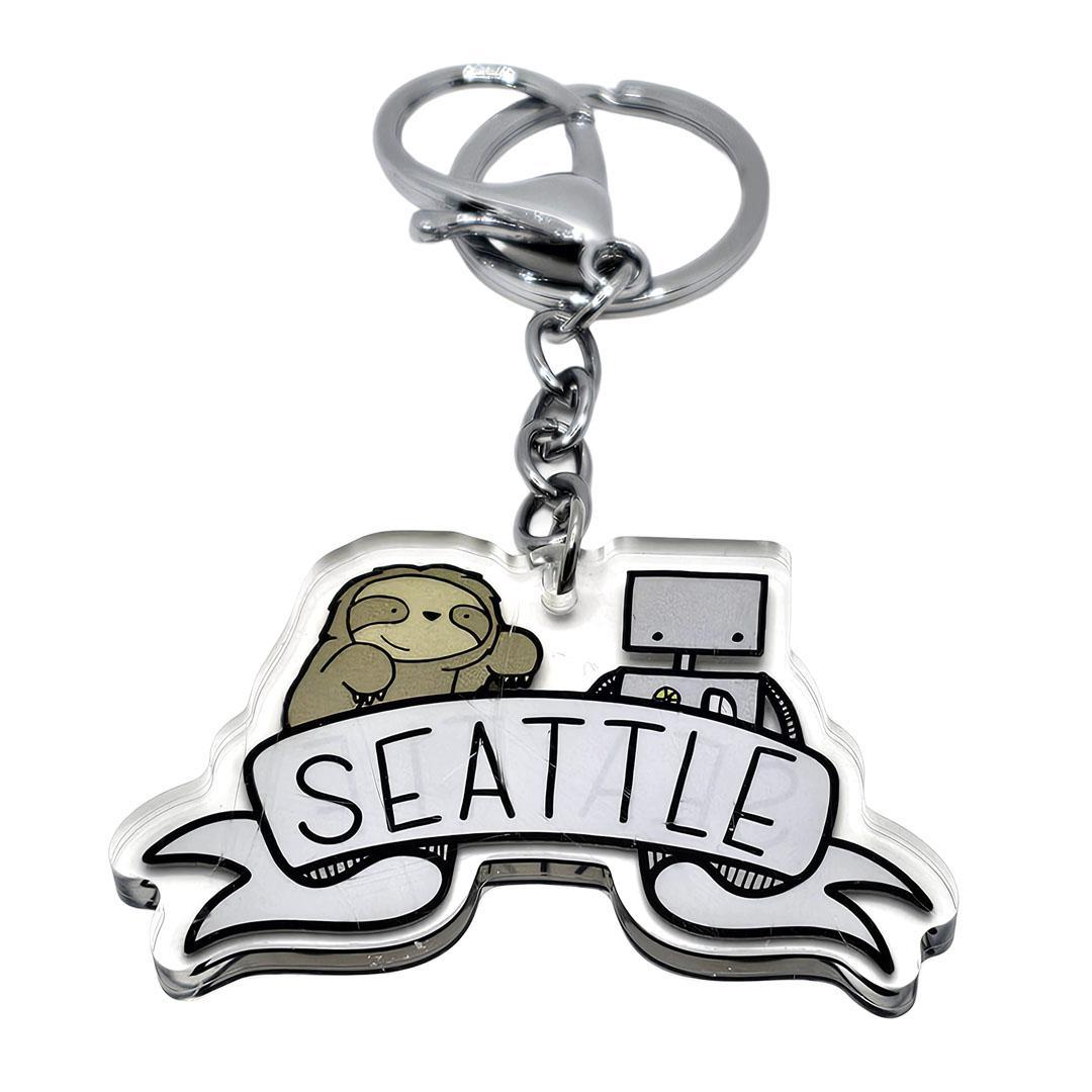 This playful Seattle-themed acrylic keychain features a charming sloth and robot illustration wrapped around a flowing ribbon banner. Lightweight yet durable, it’s a fun and functional accessory for keys, bags, backpacks, or gifting to anyone who loves Seattle.