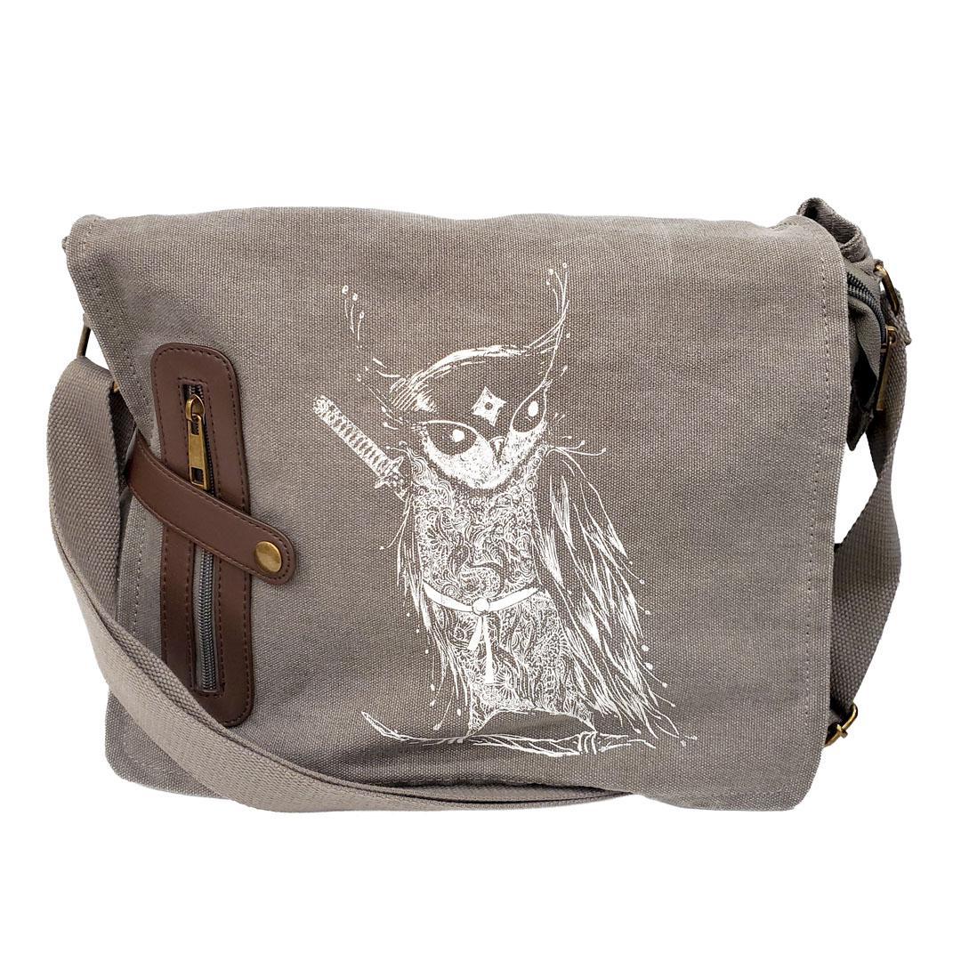 A roomy gray canvas messenger bag with pockets a-plenty and a samurai owl screen printed in white ink on the flap.