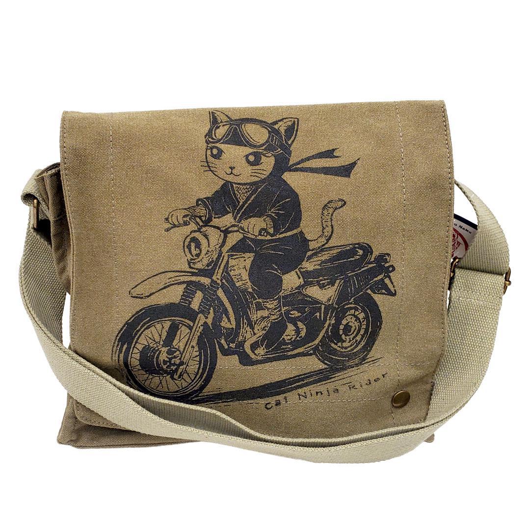 A roomy warm green canvas messenger bag with pockets a-plenty and a mischievous ninja kitty riding a motorcycle with "Cat Ninja Rider" screen printed in black ink on the flap.