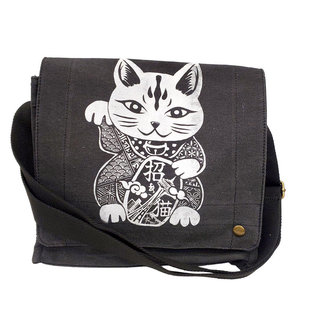NM907 $79 - Black Messenger Bag - Lucky Cat White Ink