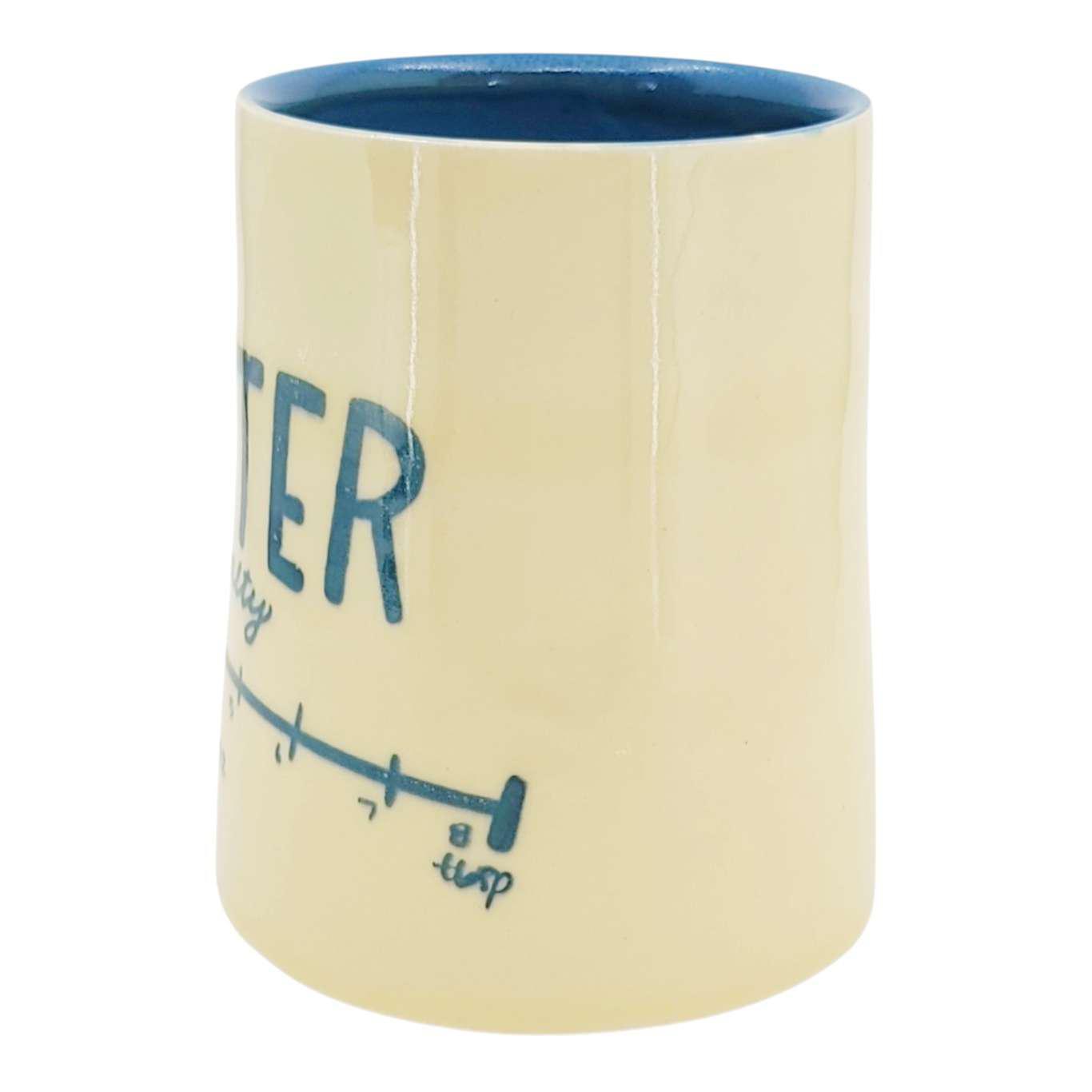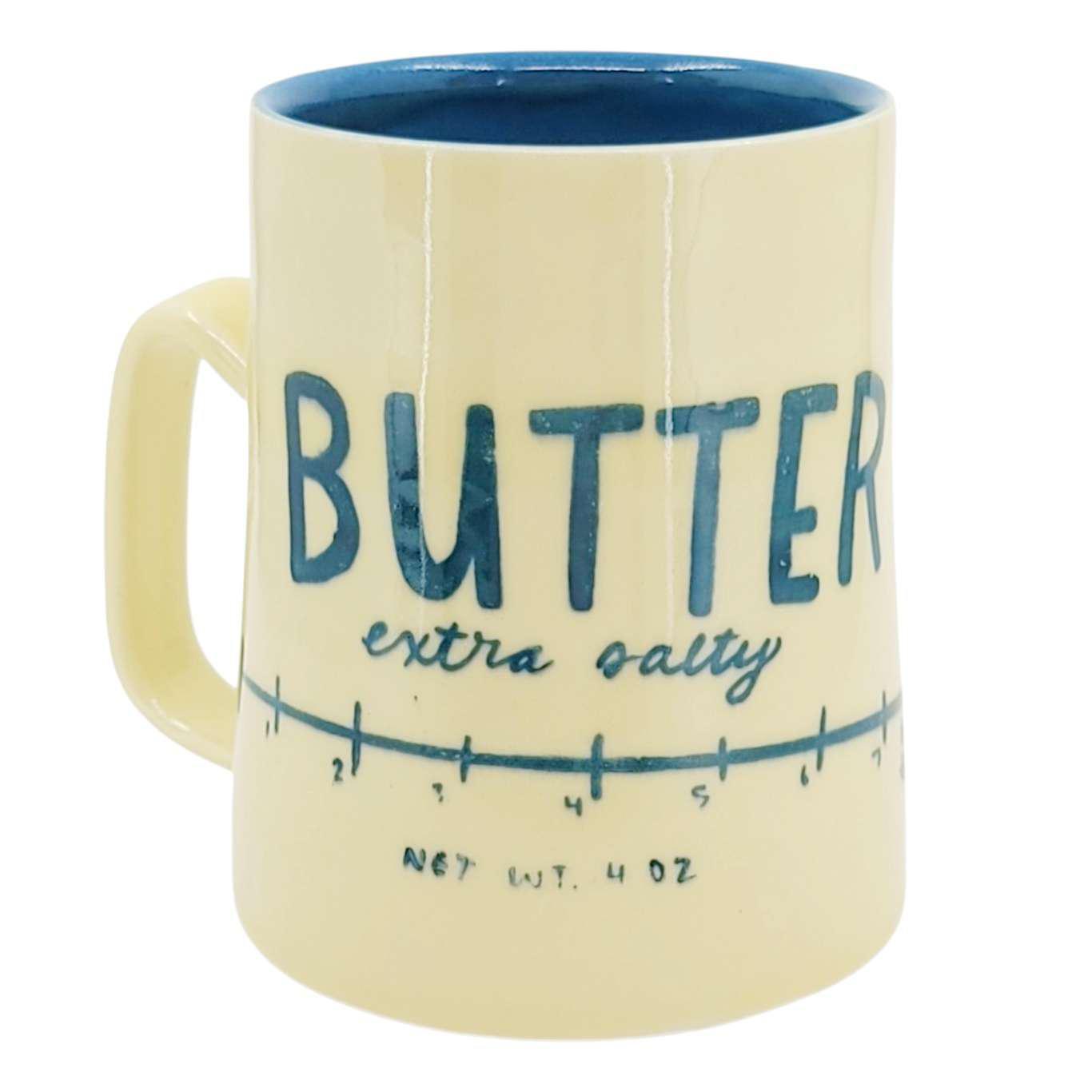 This mug is printed with a hand drawn "extra salty" butter label and is glazed with a transparent glossy butter yellow on the outside and a matte navy blue interior.