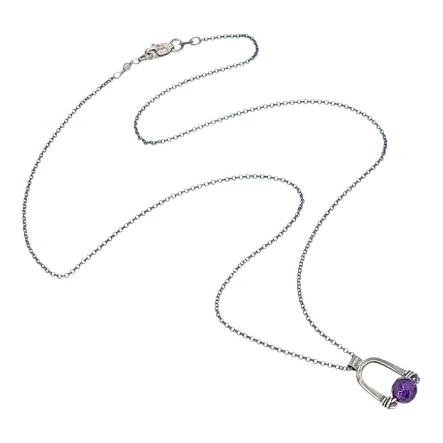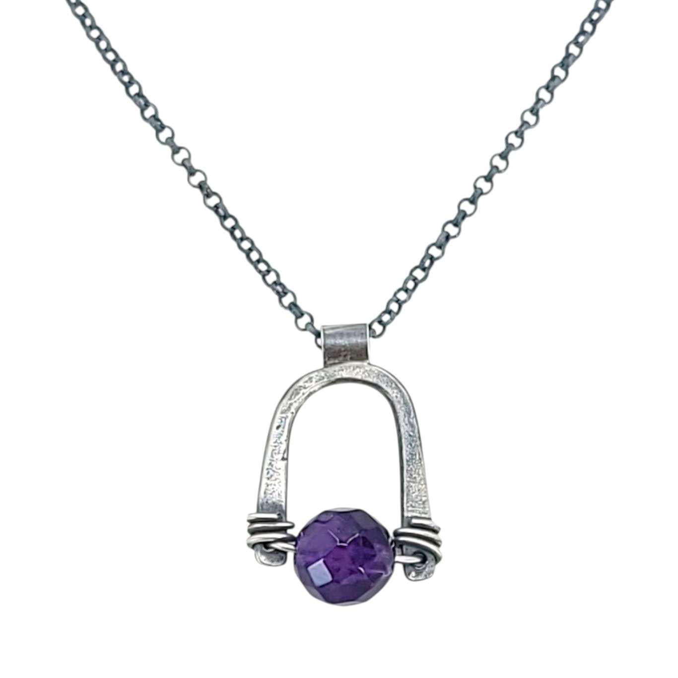 A sterling silver arch holds a genuine amethyst gemstone suspended on sterling silver wire, all hanging from an oxidized sterling silver chain. The Arc is inspired by ancient ruins and abandoned stone monoliths. It is a weathered gate cradling beneath it a gemstone bead.