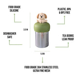 An adorable beige puppy dog lounges atop this steeper with a contrasting green base and makes loose leaf tea accessible with any size drinkware, anytime, anywhere.
