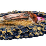 This one-of-a-kind textile artwork features a beautifully detailed (and slightly silly!) proboscis monkey hand-appliquéd against a colorful floral background and framed in a vintage-inspired painted frame.