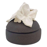 This gorgeous dark charcoal and sand-textured lidded jar was thrown on the potters wheel before a bundle of hand-sculpted flowers were attached to the lid.