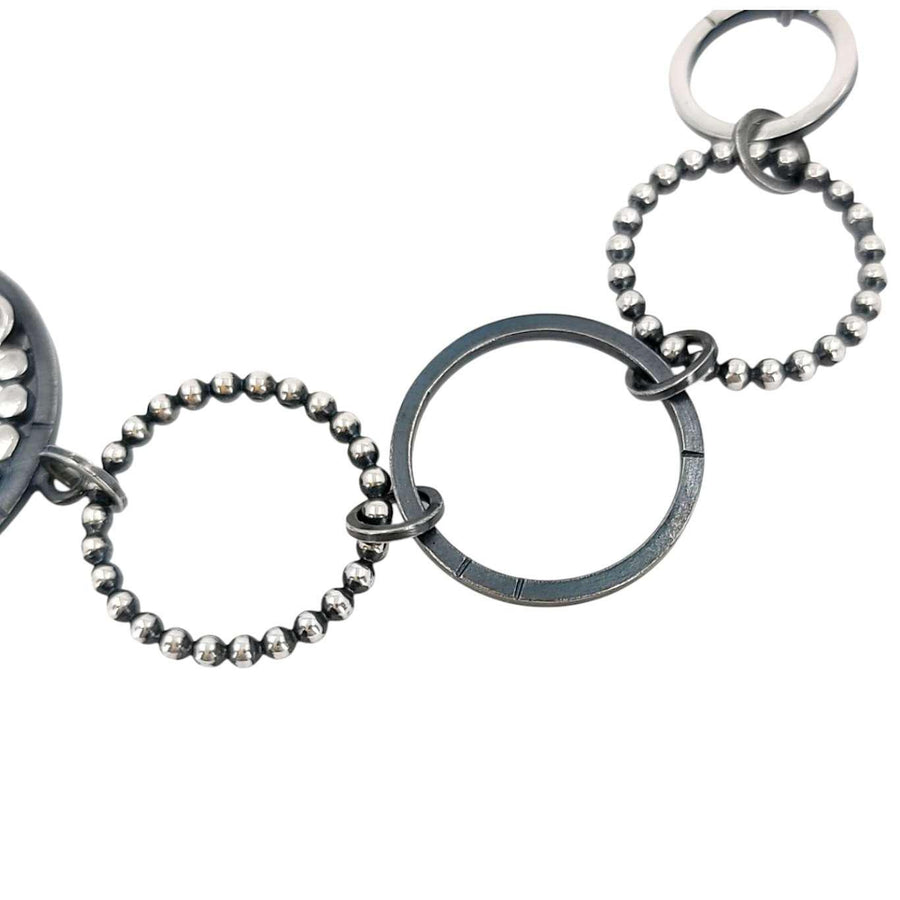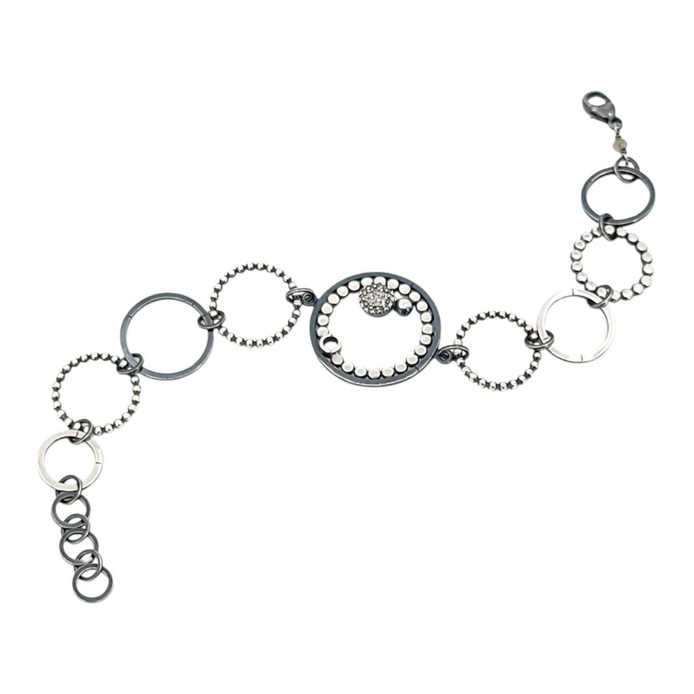 This one-of-a-kind bracelet features a playful multi-circle design with a combination of flat and textured sterling silver circles accented by discs of pavé-set salt and pepper diamonds.
