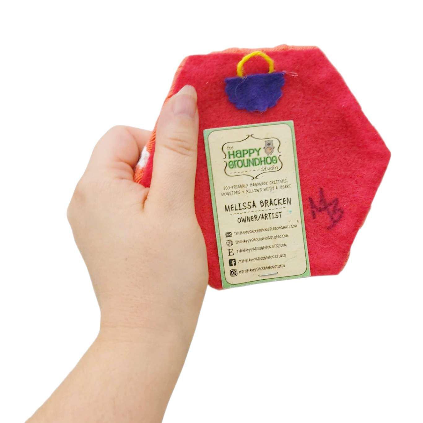 This one-of-a-kind portrait is made of fleece, upcycled sweaters, and felt stretched over a sturdy wooden frame with a yarn hanging loop on the back.