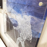 Multi-layered contemporary artwork featuring a silhouetted west-facing hiker wearing a hiking pack and holding a walking stick atop a topographical map of Tahoma (aka Mount Rainier) on clear acrylic. The artist draws with white ink following the map lines to create the image. The transparency is then backed by an original photograph printed on aluminum.