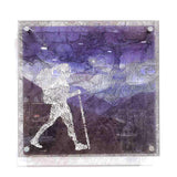 Multi-layered contemporary artwork featuring a silhouetted east-facing hiker wearing a hiking pack and holding a walking stick atop a topographical map of Tahoma (aka Mount Rainier) on clear acrylic. The artist draws with white ink following the map lines to create the image. The transparency is then backed by an original photograph printed on aluminum.