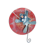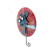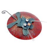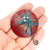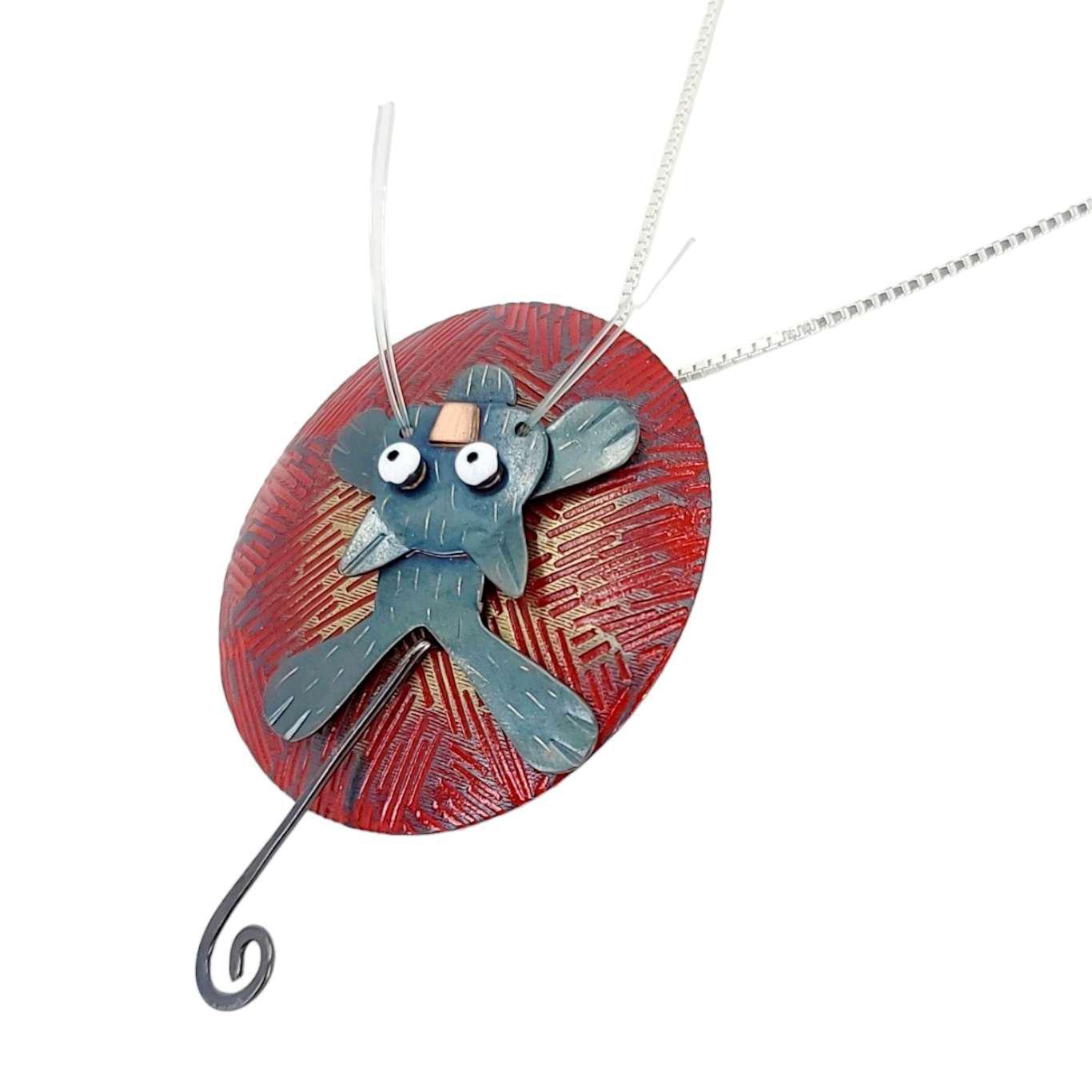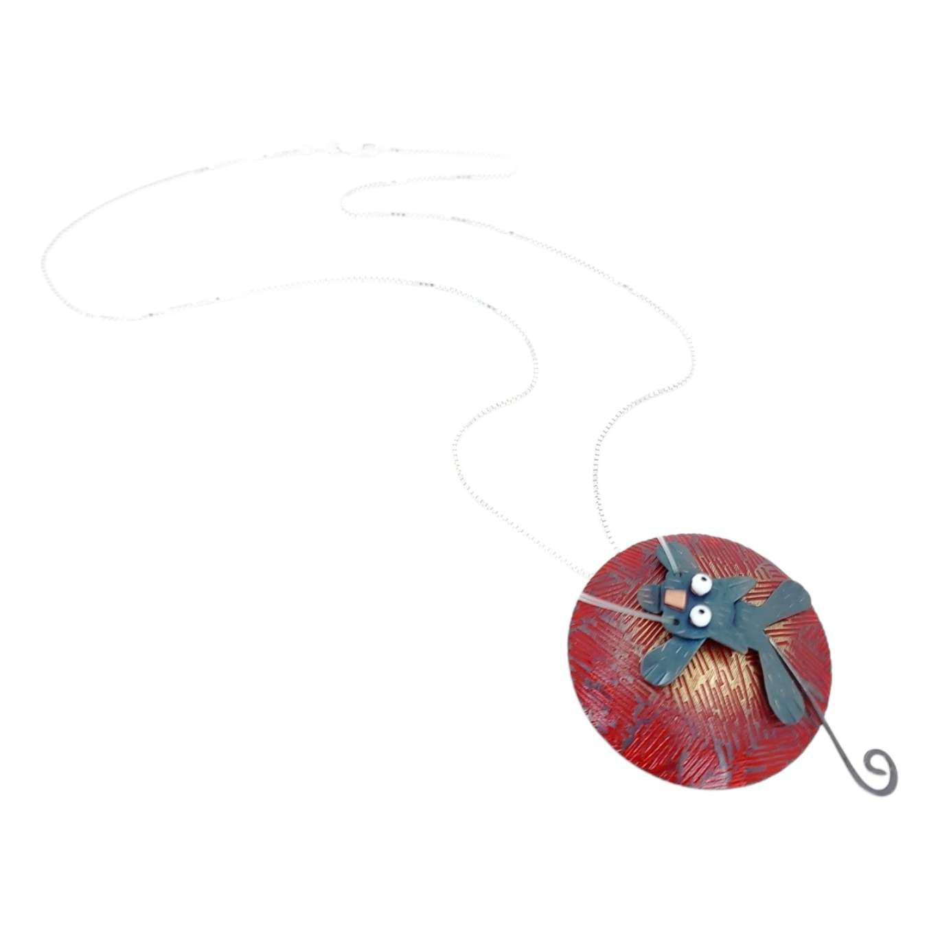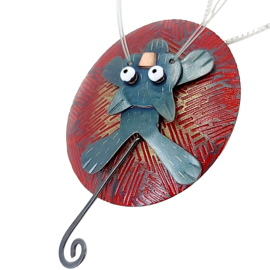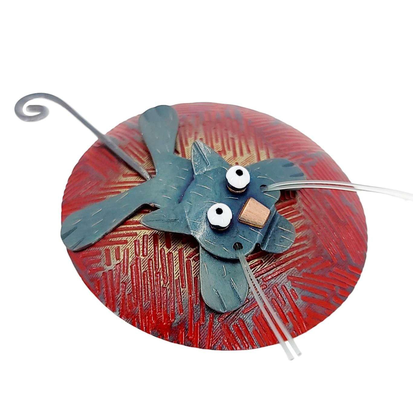 - A mischievous black cat with tiny copper nose, enamel painted eyes, monofilament whiskers, and swinging tail clings to a seemingly enormous ball of red yarn made in brass with enamel painted accents