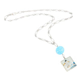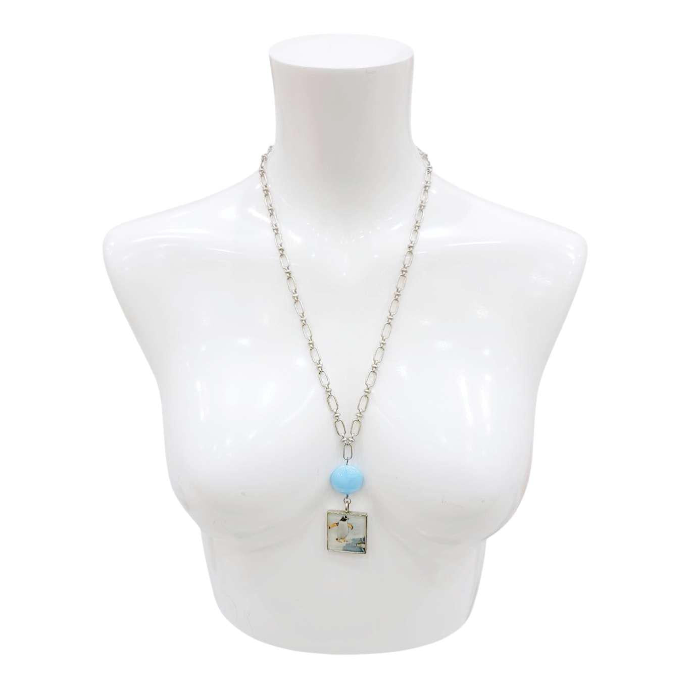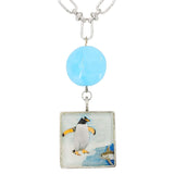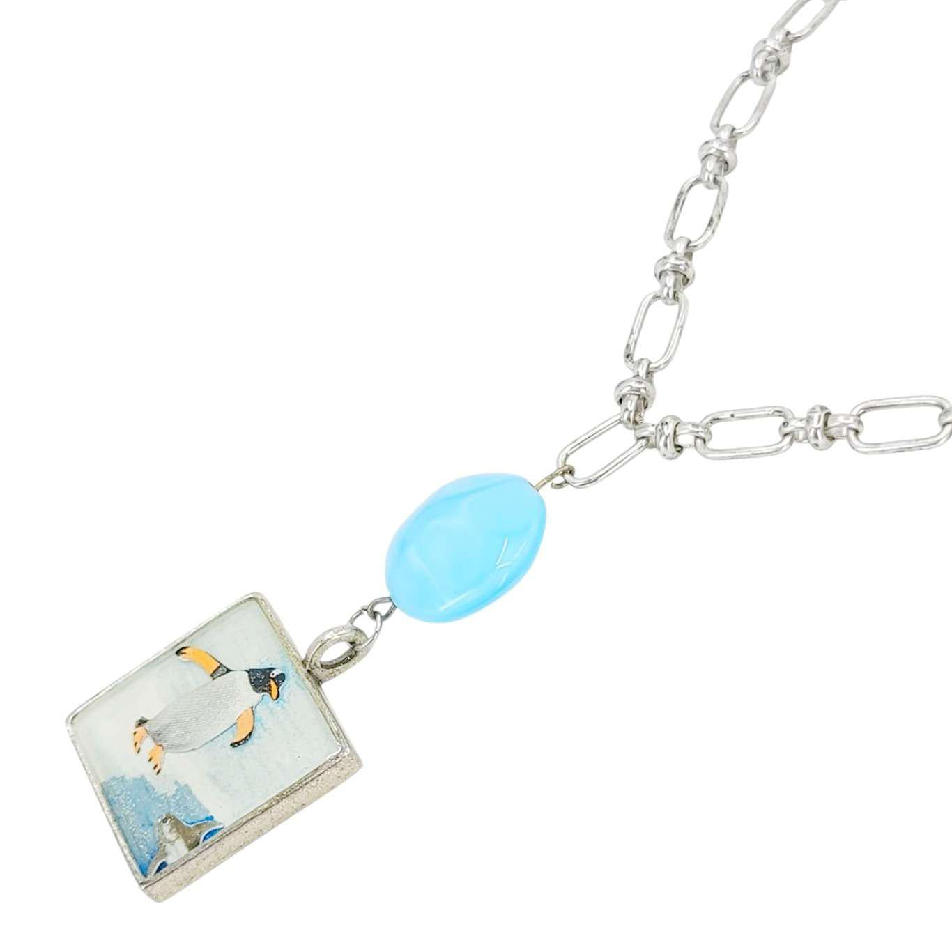A curious penguin peeks over the edge of an ice floe to check out a sunfish who’s taken a wrong turn on this whimsical necklace.