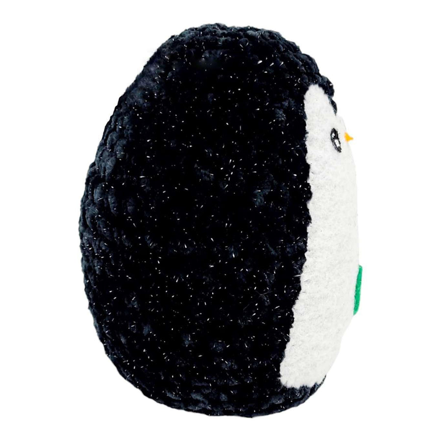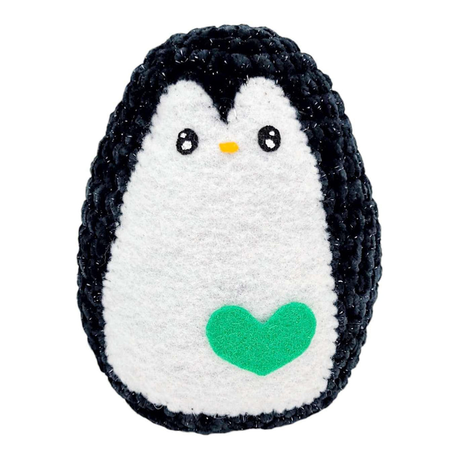 This little crocheted penguin is the cutest plush friend with its sparkly black body, white felt belly with hand-painted face, and vivid Kelly green heart.