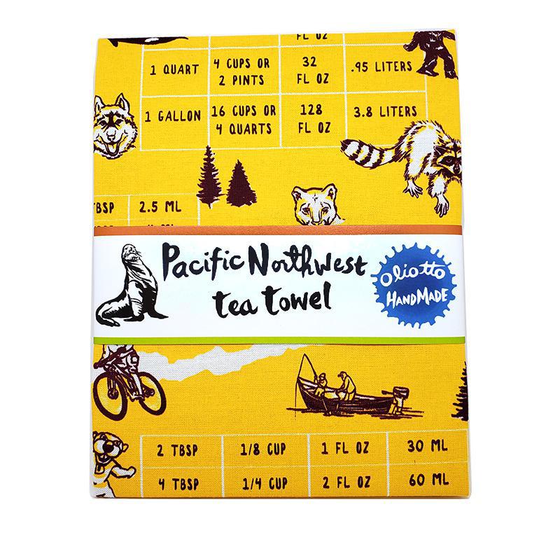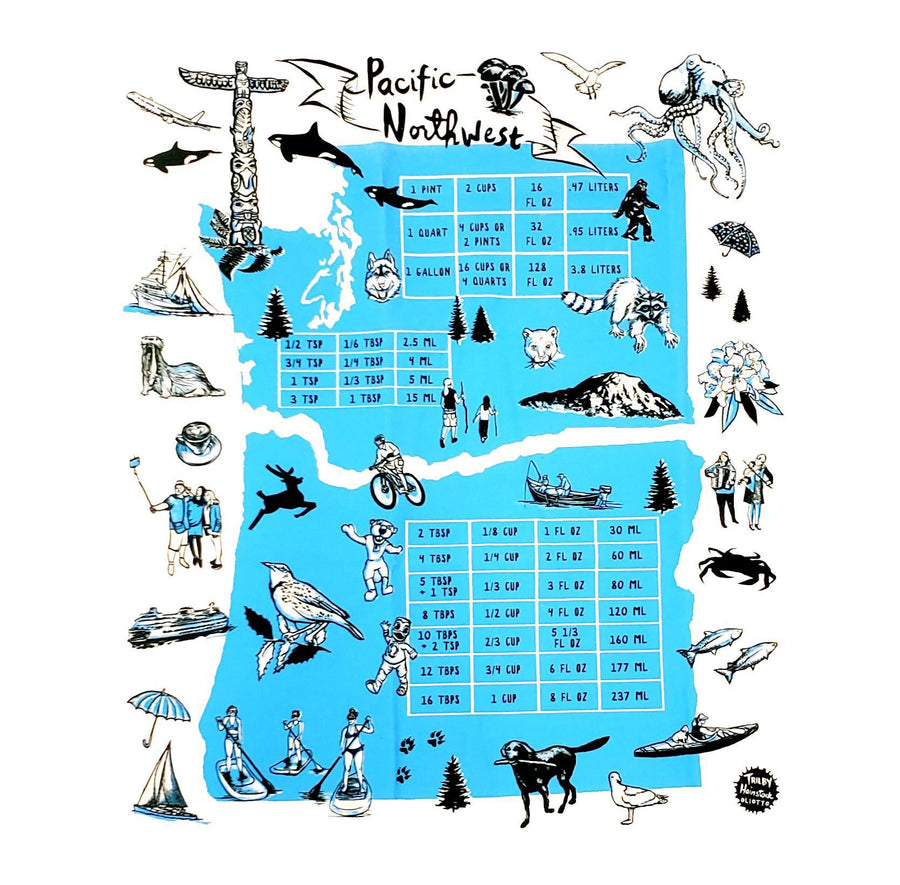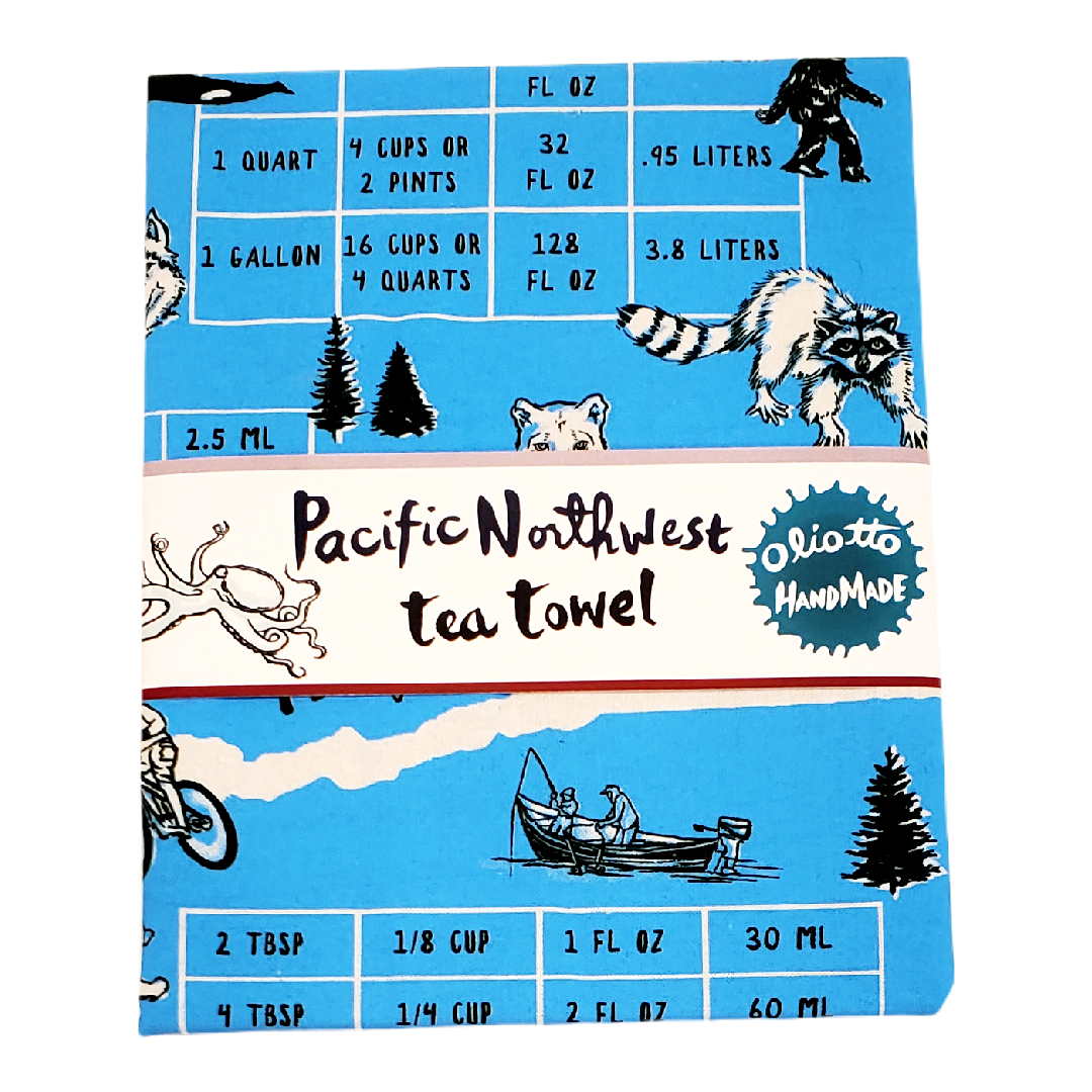 This charming 100% cotton flour sack tea towel, showcases captivating Pacific Northwest illustrations that pay homage to the region's culture, native plant life, and wildlife. With its charm and practical cooking conversion tables, it's a delightful addition to any kitchen! Available in 3 different solid colors.