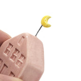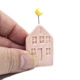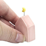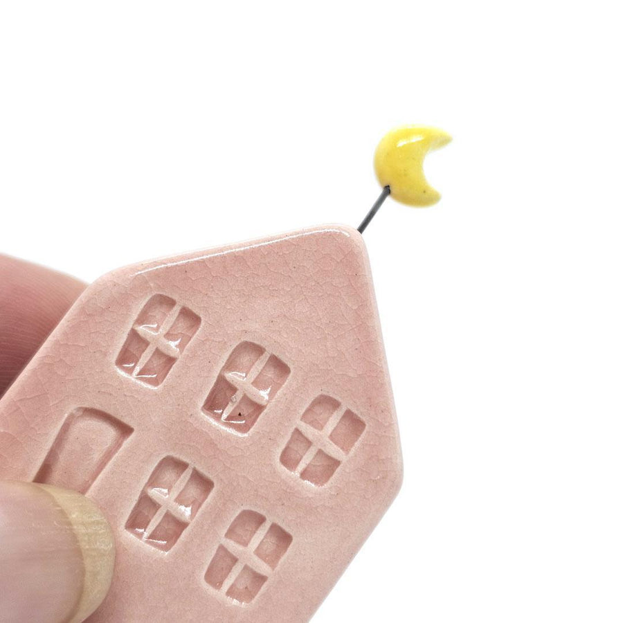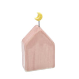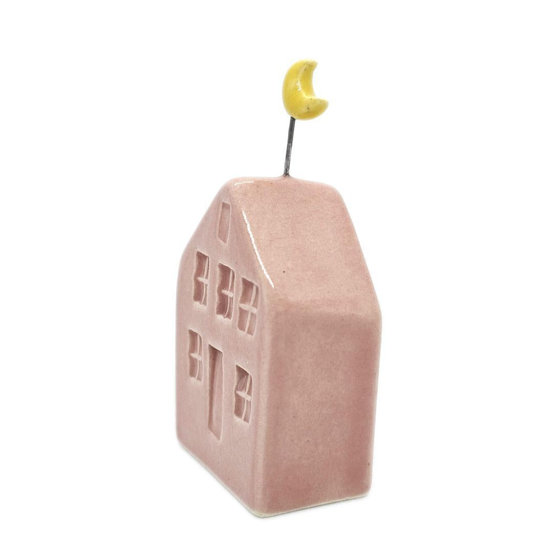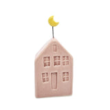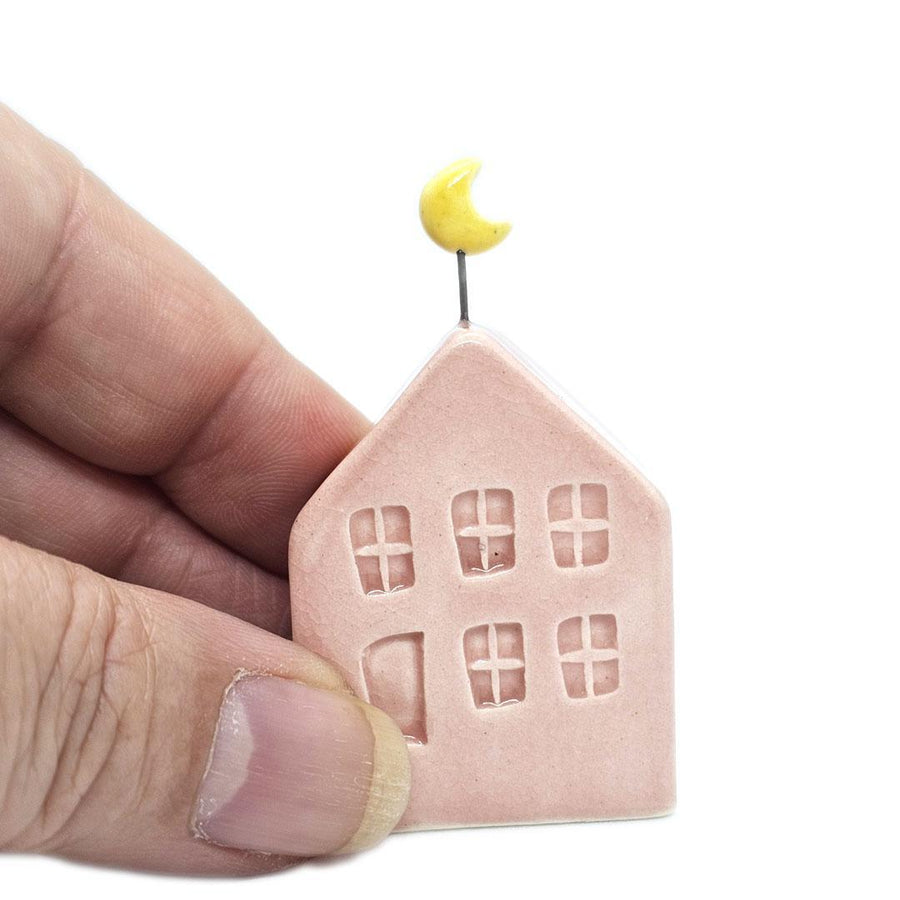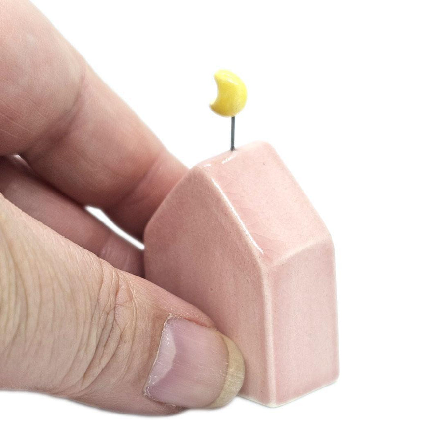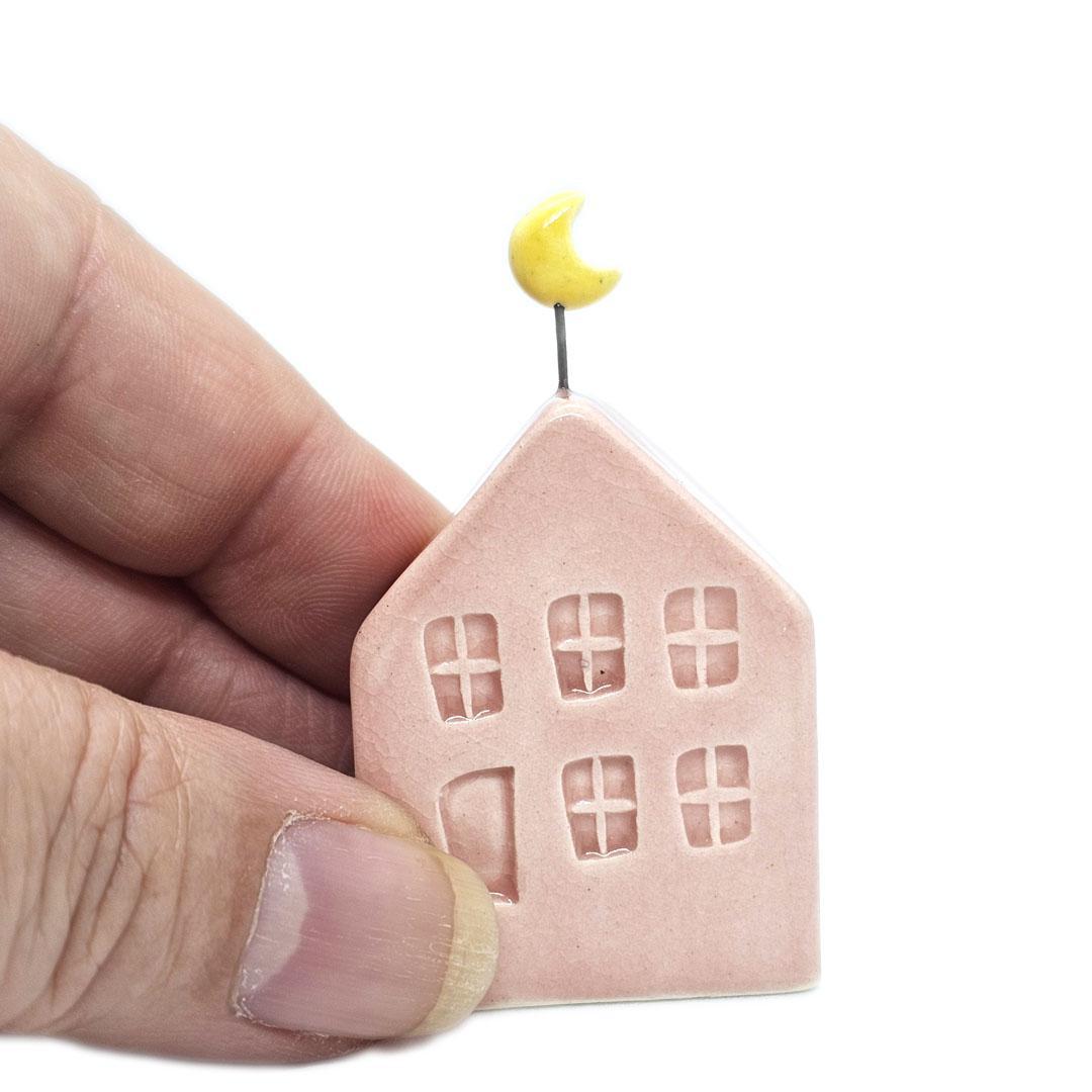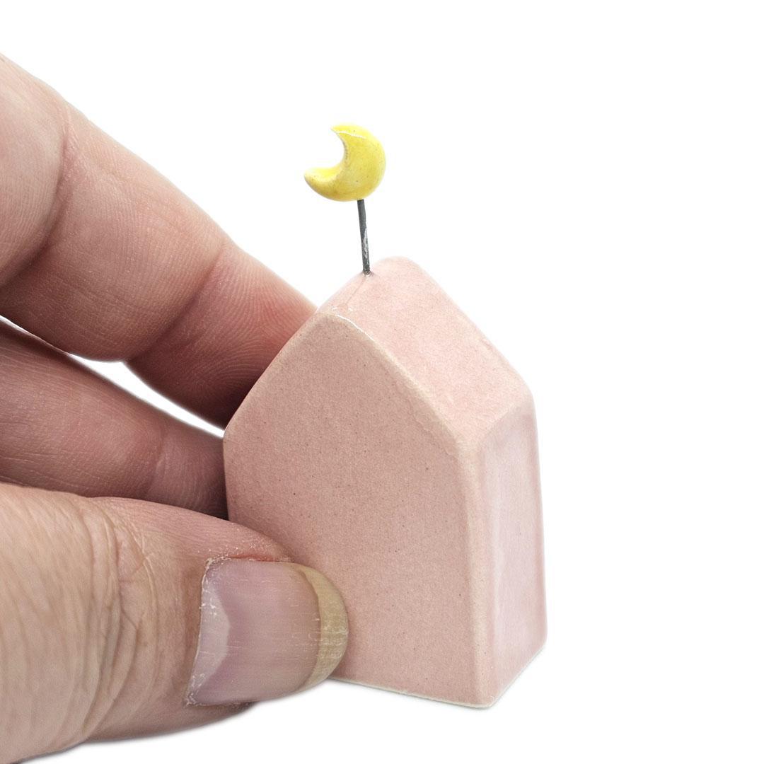 Tiny collectible ceramic houses, each with a tiny crescent moon floating above its roof. Each house is individually made and one of a kind.