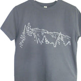Wear your love for the outdoors on your sleeve - well, on your chest, anyway! A mountain ridge with trees stands proudly across the front of this comfortable cotton shirt. Screen-printed by hand in off-white ink on a gray background. Shirt is made of soft 100% organic cotton and has a loose straight cut shape with a crew neck and short sleeves.