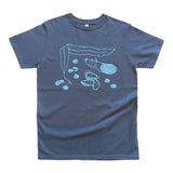 Clams, mussels and oysters are scattered about with a cute crab hiding in their midst, decorating the front of this comfortable shirt. Screen-printed by hand in light blue ink on a dark blue background.