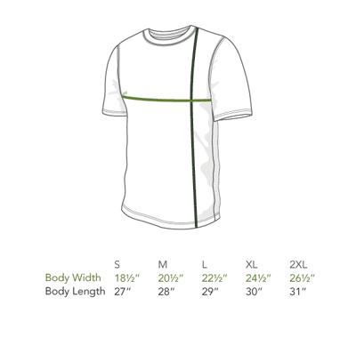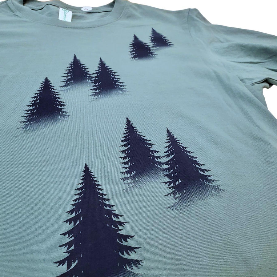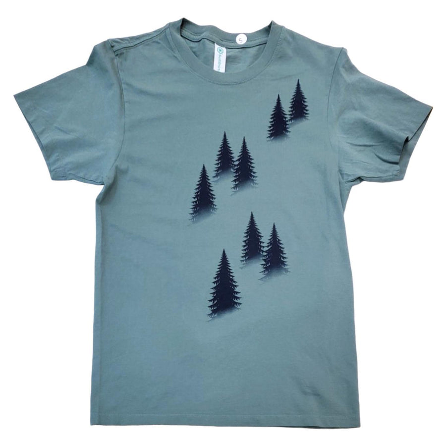 A beautiful evergreen treeline fades into the soft green on the front of this comfortable shirt.