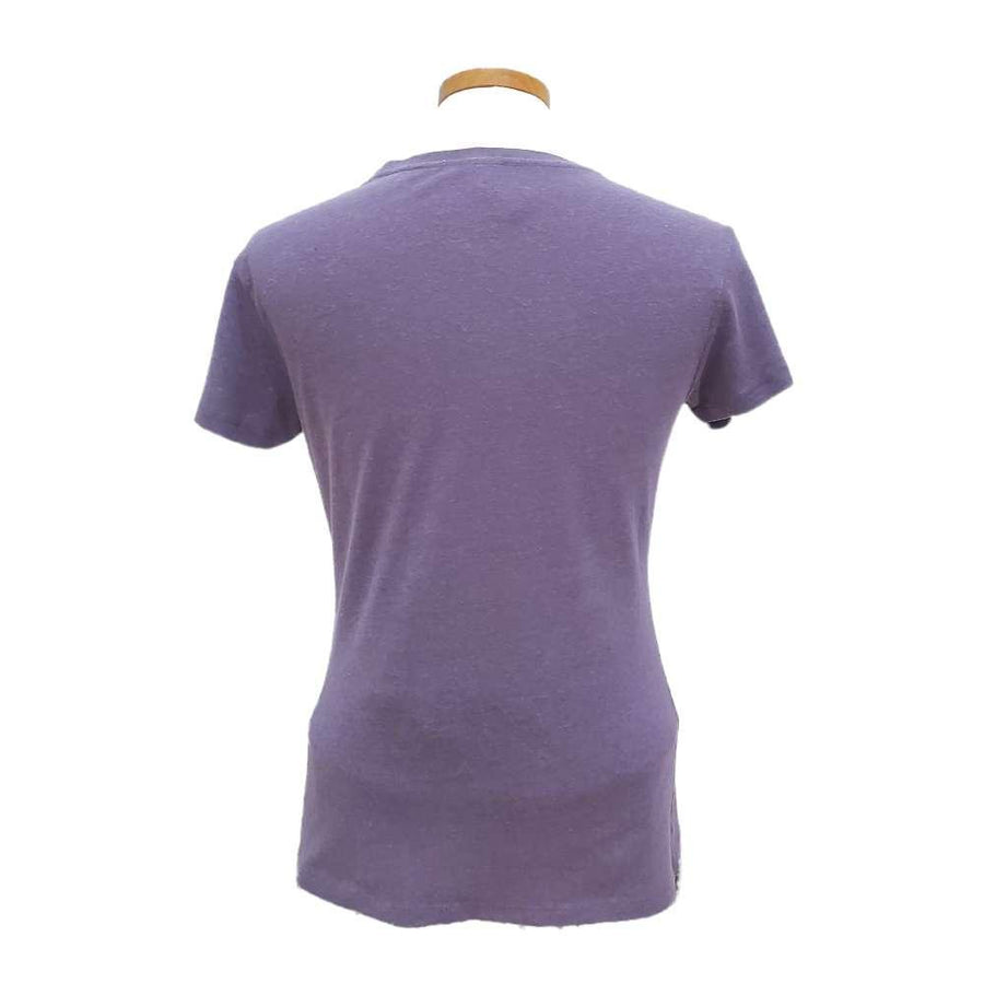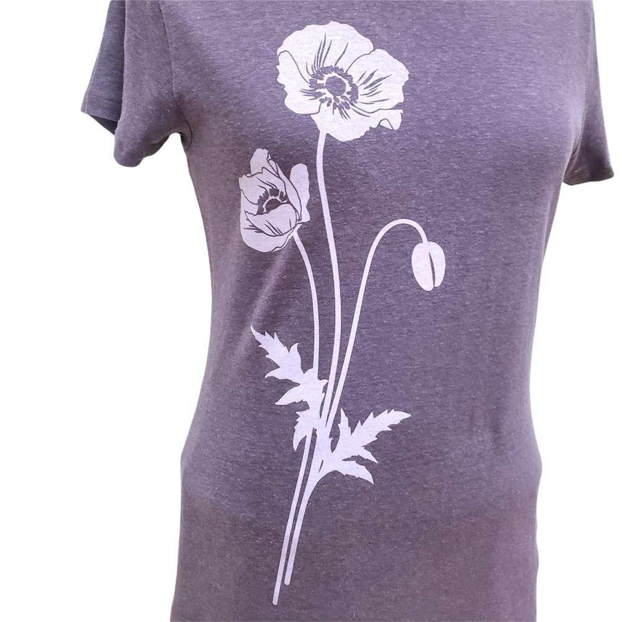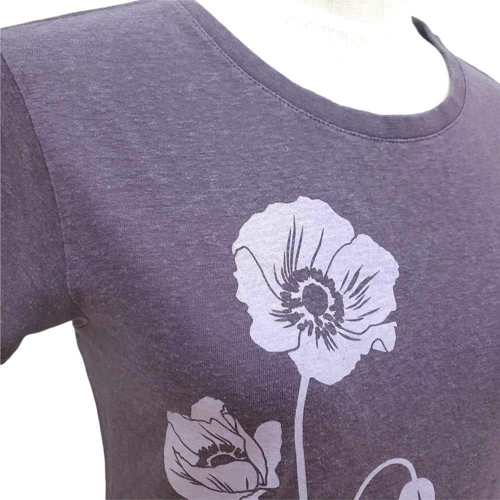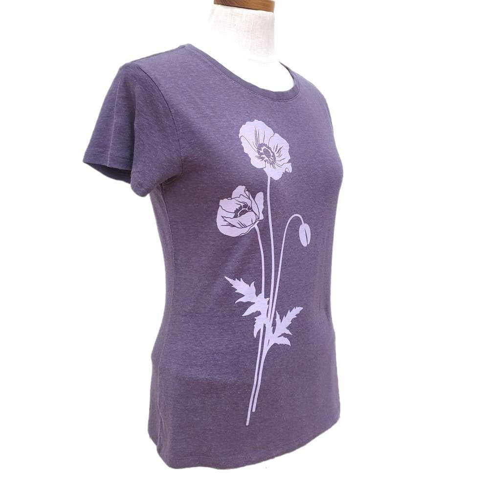 Light purple poppies grace the front of this super comfortable deep purple shirt, screen printed by hand. Shirt is made of super soft hemp/organic cotton blend and has a slightly contoured shape with a crew neck and short sleeves.