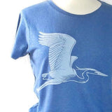 A graceful heron sweeps across the front of this super comfortable shirt. Screen-printed by hand in white ink on a blue background. Shirt is made of super soft hemp/organic cotton blend and has a slightly contoured shape with a crew neck and short sleeves.