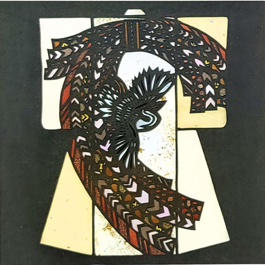 This lovely card features a reproduction of Mia Yoshihara’s large-scale heron-themed kimono wall art, originally made with washi paper. Comes with a matching square envelope.