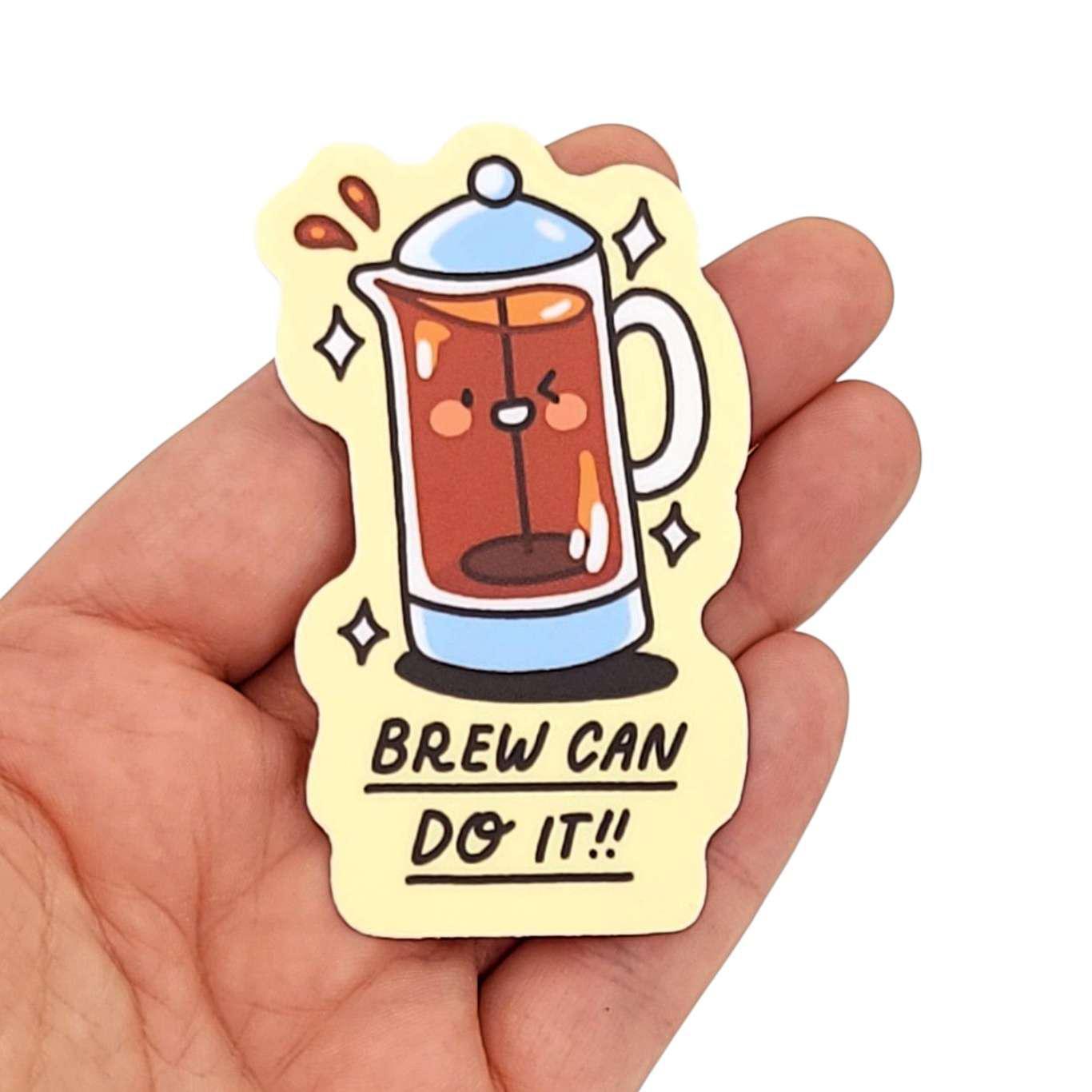 This vinyl sticker features the original artwork by Mis0 Happy -- a smiling French press offers encouragement and says, "Brew can do it!!" on a cream background.
