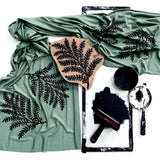 A fresh moss green lightweight jersey scarf with a hand-printed leafy print on each end in black ink.