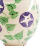 This lovely medium-sized vase features a rounded body with a wide mouth and is decorated with morning glory flowers in dusty purple and soft green with genuine 22k gold luster accents.